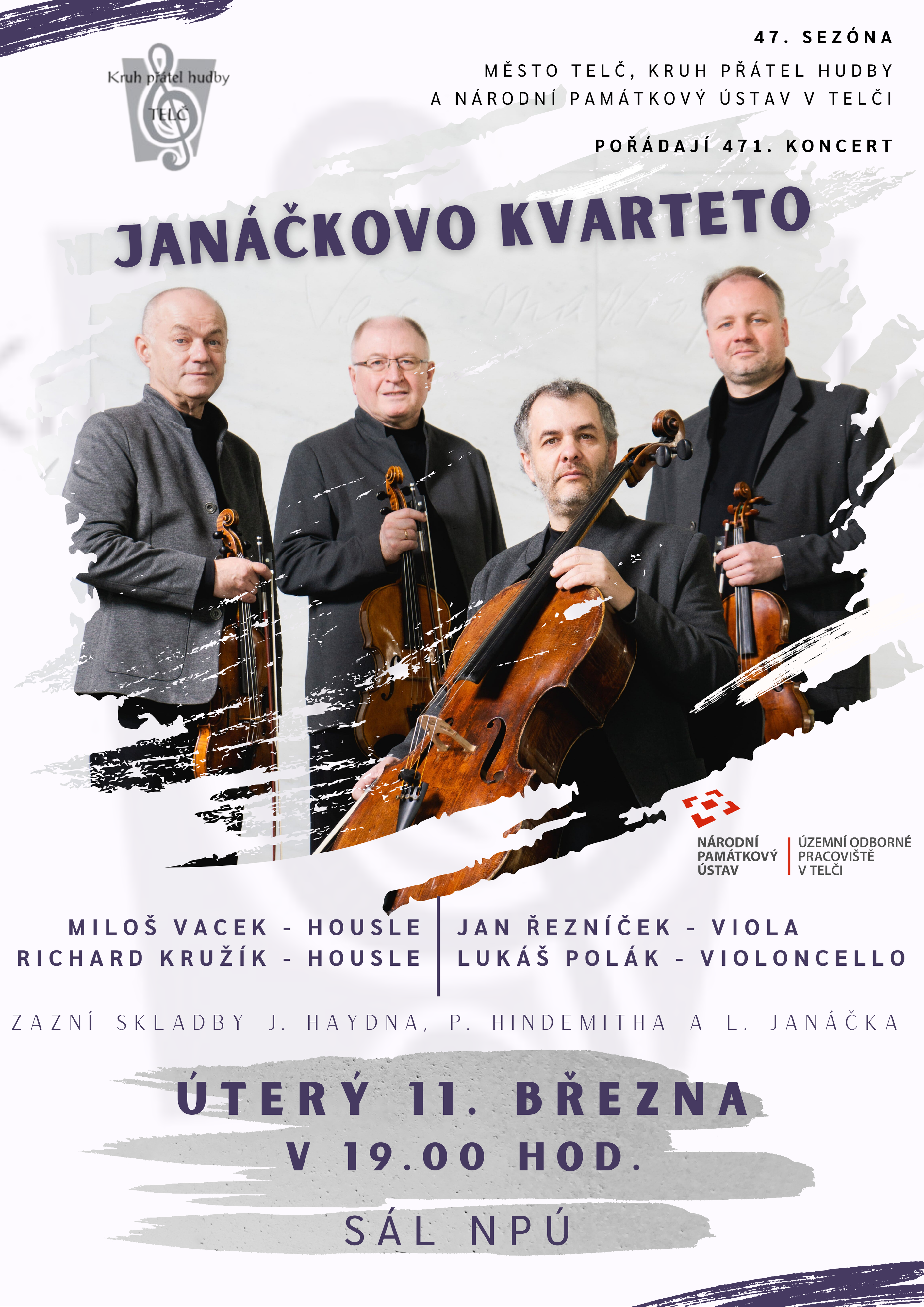 V sídle územního odborného pracoviště Národního památkového ústavu v Telči se v úterý 11. března 2025 v 19.00 hodin uskuteční koncert Janáčkova kvarteta.