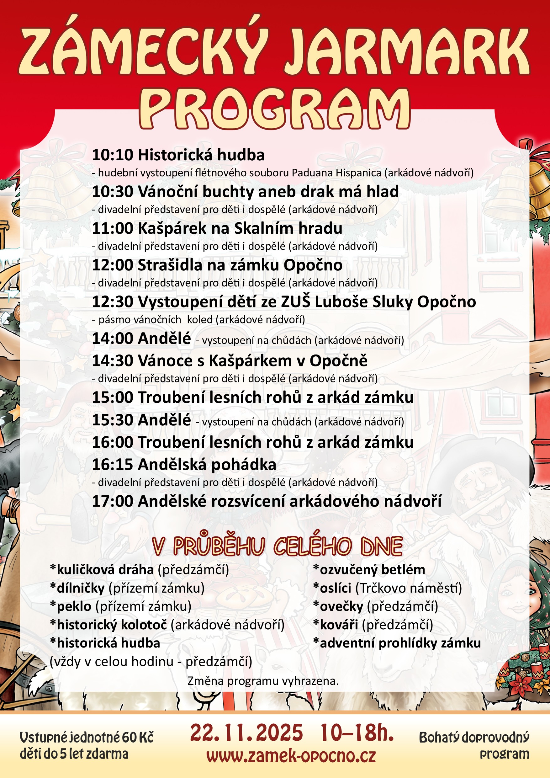 V průběhu celého dne divadelní představení pro děti, chodci na chůdách, kuličková dráha na prvním nádvoří, historická hudba na prvním nádvoří (předzámčí), dílničky pro děti v prostorách bývalé zámecké kuchyně - vstup z arkádového nádvoří poblíž vstupu do zámku, peklo vs nebe s hodnými čerty a anděly s pekelnou váhou (můžete se zvážit a vyzkoušet, jak velcí jste hříšníci a zda patříte do nebe či do pekla), kolotoč pro nejmenší na arkádovém nádvoří, adventní prohlídky interiérů zámku s průvodcem (vstupenky k zakoupení on-line nebo přímo na pokladně zámku), slamněný betlém před hladomornou s další novou postavou, před vstupem do zámecké brány oslíci (Trčkovo náměstí)i, kteří vás povozí, živé ovečky v ohradě pod ořešákem na I. zám. nádvoří, kováři ... a na arkádovém nádvoří se po setmění můžete vyfotit na zámecké lavičce.