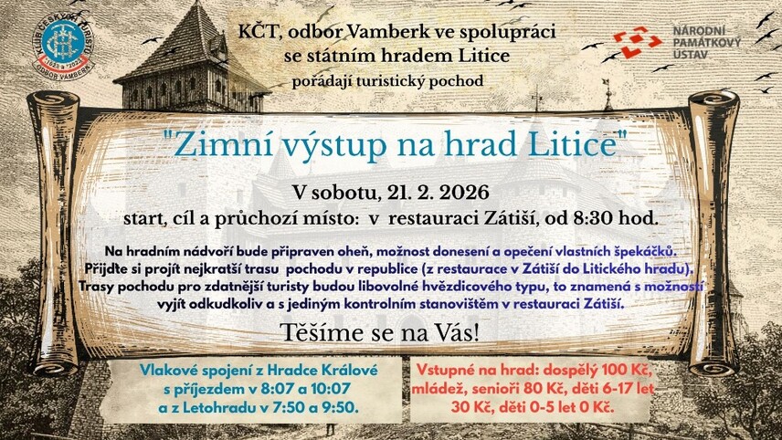 KČT ve spolupráci s hradem Litice pořádají od 8:30 hod. turistický pochod. Start, cíl a průchozí místo je v restauraci Zátiší. Na hradním nádvoří bude připraven oheň, aby si děti mohly opéci svou kořist za dobytí hradu.