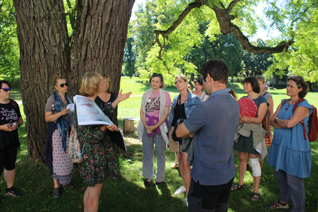 Následující den se konala prohlídka zámeckého parku pod vedením Lenky Křesadlové z Metodického centra zahradní kultury (NPÚ). Poutavým způsobem seznámila účastníky letní školy s historickými vrstvami zahrad od renesanční přes barokní až po krajinářský park. Prohlídka byla obohacena o drobné edukační intervence naznačující jakým způsobem je možné informace didakticky transformovat pro děti a mládež.