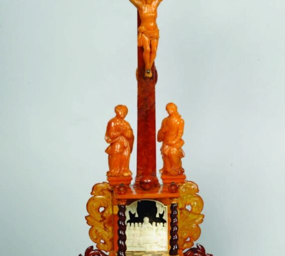 Původ jantaru, v němž byl spatřován druh vosku či dokonce drahokamu, nebyl dlouho objasněn a byl zahalen legendami, které mu propůjčovaly kosmologický význam odrážející se také v jeho pozdějších označeních jako sluneční či hořící kámen. Skutečný původ jantaru jako fosilní pryskyřice paleogenních jehličnanů (Pinus succinifera) rozšířených v severní Evropě asi před 40 milióny lety byl odhalen až po polovině 18. století. I když výskyt jantaru byl omezen především na určitou oblast severního pobřeží, byl velmi vyhledávaným materiálem pro výrobu uměleckých předmětů, jejíž historie je stará asi deset tisíc let. Představoval pozoruhodnou surovinu pro umělecké zpracování, která poutala velmi pestrou barevnou stupnicí od bílého tzv. kostního jantaru přes různé tóny žluté barvy až po tmavě hnědé odstíny s různou mírou průsvitnosti a umožňovala velmi rafinované barevné kombinace v kompozicích. Tajemná aura obklopující původ jantaru a možnosti jeho působivého uměleckého zpracování podnítily zájem sběratelů a jantarové předměty byly vyhledávaným uměleckým artiklem pro sbírky kunstkomor na evropských panovnických a aristokratických dvorech. Umělecké artefakty z jantaru nechyběly od konce 16. století v pokladnici habsburských panovníků. Obdivné poznámky o různých uměleckých předmětech z jantaru nevynechaly ve svých zprávách ani cestovatelé, kteří ve Vídni v 17. a 18. století navštívili habsburskou pokladnici. Z dobových inventářů moravských aristokratických sídel je však možné usuzovat, že jantarové artefakty byly v moravském prostředí v 17. a 18. století zcela výjimečnou sběratelskou akvizicí (Lev Vilém Kounic, biskup Karel Liechtenstein-Castelkorn, sbírky Liechtensteinů-Castelkornů v Brně a na Pernštejně).