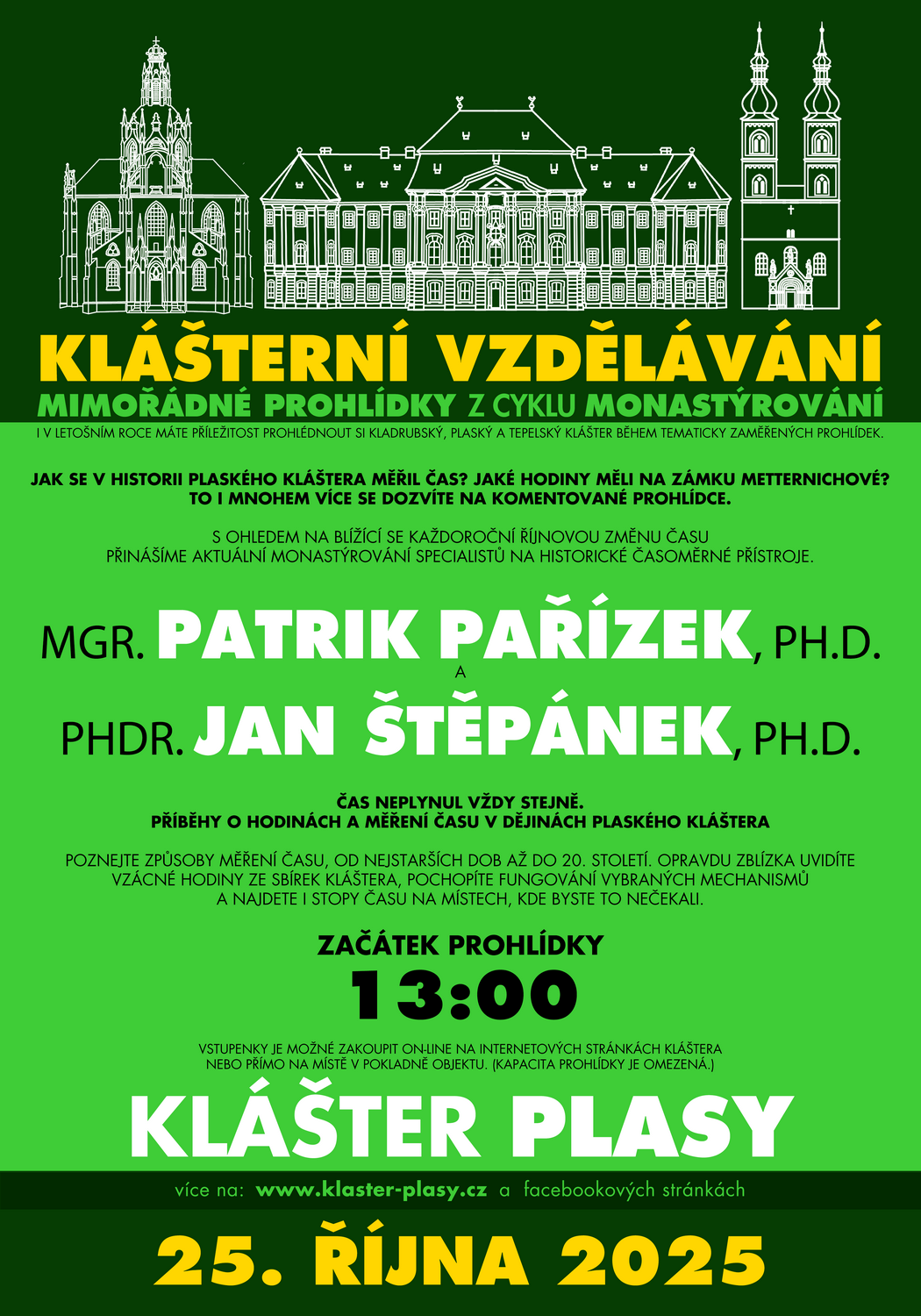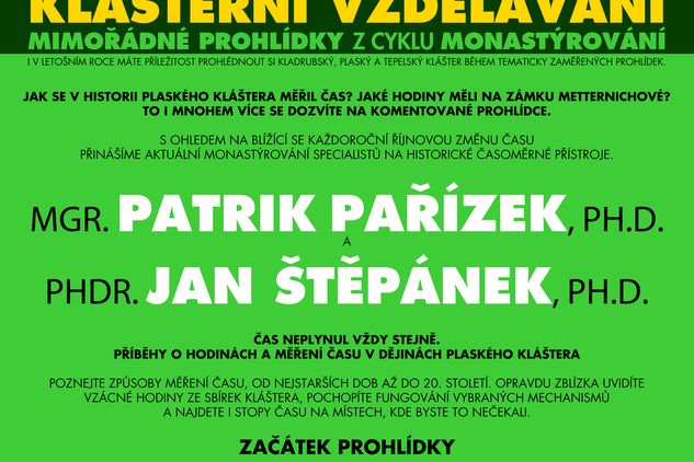 Prohlídka z cyklu Monastýrování bude tentokrát zaměřena - s ohledem na každoroční říjnovou změnu času - na velmi aktuální téma: Odborník na časoměrné stroje Mgr. Patrik Pařízek, Ph.D. a historik umění PhDr. Jan Štěpánek, PhD. přiblíží způsoby měření času od nejstarších dob až do 20. století. Čekají nás detailní prohlídky vzácných hodin ze sbírek kláštera, praktické ukázky fungování vybraných mechanismů i hledání stop času na místech, kde byste jej vůbec nečekali.