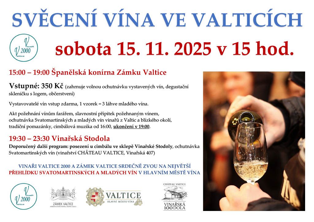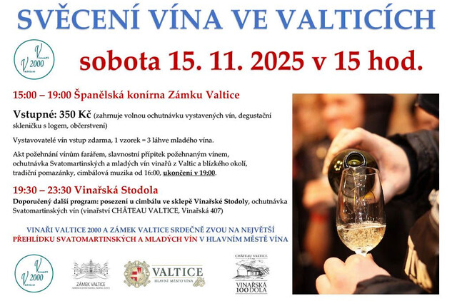 Ochutnávka mladých vín se uskuteční ve Španělské konírně zámku Valtice v sobotu 15. listopadu od 15:00. Vstupenky na místě, vstupné je 350 Kč. V ceně vstupu je sklenička, volná ochutnávka veškerých vín a domácích pomazánek. Degustace a konzumace formou samoobsluhy.