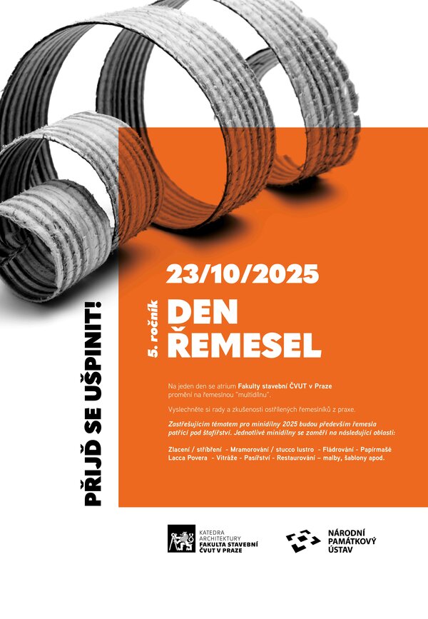 Den řemesel s podtitulem Přijď se ušpinit se koná ve čtvrtek 23. října na Fakultě stavební ČVUT v Praze Dejvicích, Thákurova 7. Od 9.00 hod. se lze zúčastnit přednášky představující jednotlivá řemesla, v čase 10.00 – 16.00 hod. bude v atriu probíhat workshop na stanovištích věnujících se jednotlivým řemeslům. Akce je určená odborné i laické veřejnosti. Vstup je zdarma.