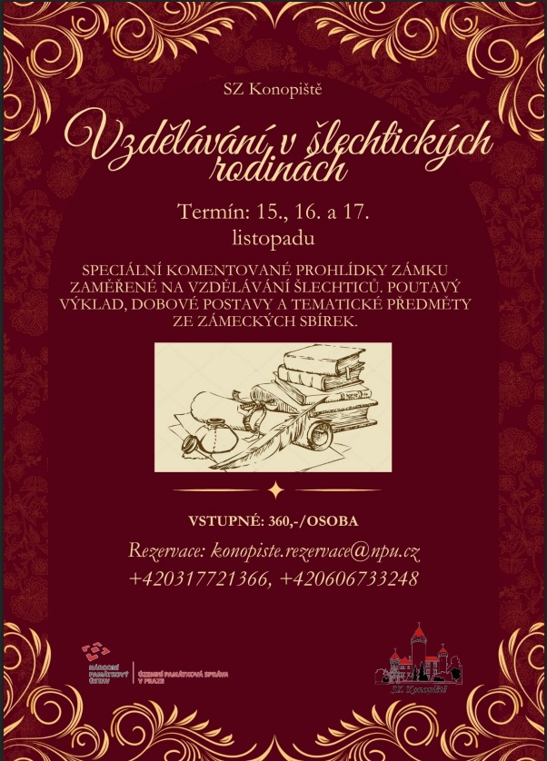 Na víkend 15., 16. a pondělí 17. listopadu je připravená mimořádná prohlídka, věnovaná vývoji studií s leckdy až kuriozními zajímavostmi. Výjimečně se naskytne příležitost prohlédnout si učební pomůcky dětí arcivévody Františka Ferdinanda d´Este. Dozvíte se také, jakou výuku absolvovaly děti v šlechtických rodinách a jak výuka probíhala.