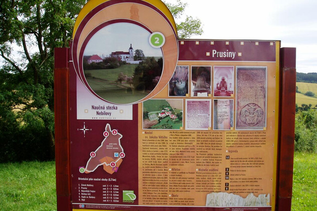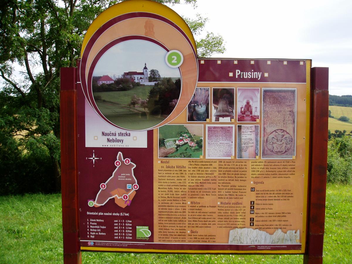 Výchozím bodem naučné stezky je prostor u kaple před zámkem Nebílovy. Odtud pokračujte z kopce dolů a za obcí dále do mírného svahu k druhé zastávce, kterou je osada Prusiny. Osada leží v místě někdejšího sídliště slovanské kultury, byly zde nalezeny tři objekty mohylové kultury ze střední doby bronzové. V osadě se dnes nachází kostel s bývalou školou a hřbitov. První zmínka o kostele sv. Jakuba Většího, který je dominantou zdejší krajiny, pochází z roku 1366. Současná stavba pochází z roku 1722 a na jejím vzniku se podílel významný český barokní architekt František Maxmilián Kaňka. V bývalé škole dnes sídlí terénní stanice občanského sdružení Ametyst.