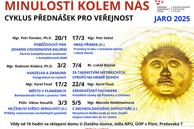 V roce 2025 bude již v lednu zahájen 3. ročník přednáškového cyklu, který územní odborné pracoviště NPÚ v Plzni pořádá. Stejně jako samotný obor památkové péče je i tematická skladba přednášek pestrá a široká. Přednášky mají populárně naučnou formu, takže nejsou určeny jen pro odborníky z oboru, ale pro všechny, kdo mají zájem dozvědět se něco zajímavého z naší historie. Přednášejícími jsou jak památkáři pracoviště, tak i hostující odborníci. Vedle představení restaurovaných sochařských děl a nastínění vývoje hradu Přimda, které zazní ve svém druhém pokračování, se mohou posluchači těšit například na fotografie z cest známých cestovatelů Hanzelky a Zikmunda, dozví se o následcích bombardování Plzně před osmdesáti lety, mohou se dozvědět o tajemství mimořádných renesančních stropů, které se restaurovaly na hradě Švihov, seznámí se s tzv. fachwerkem, tedy hrázděnou lidovou architekturou, a budou moci „nahlédnout“ do archeologického depozitáře pracoviště, kde se ukrývají např. i unikátní románské dlaždice. První přednáška v novém roce, která se uskuteční již 20. ledna, se bude věnovat excentrickému aristokratovi Johannu Coudenhove-Kalergimu, někdejšímu majiteli zámku Poběžovice, který byl synem hraběnky Micuko, jedné z vůbec prvních Japonek, které se přistěhovaly do Evropy.