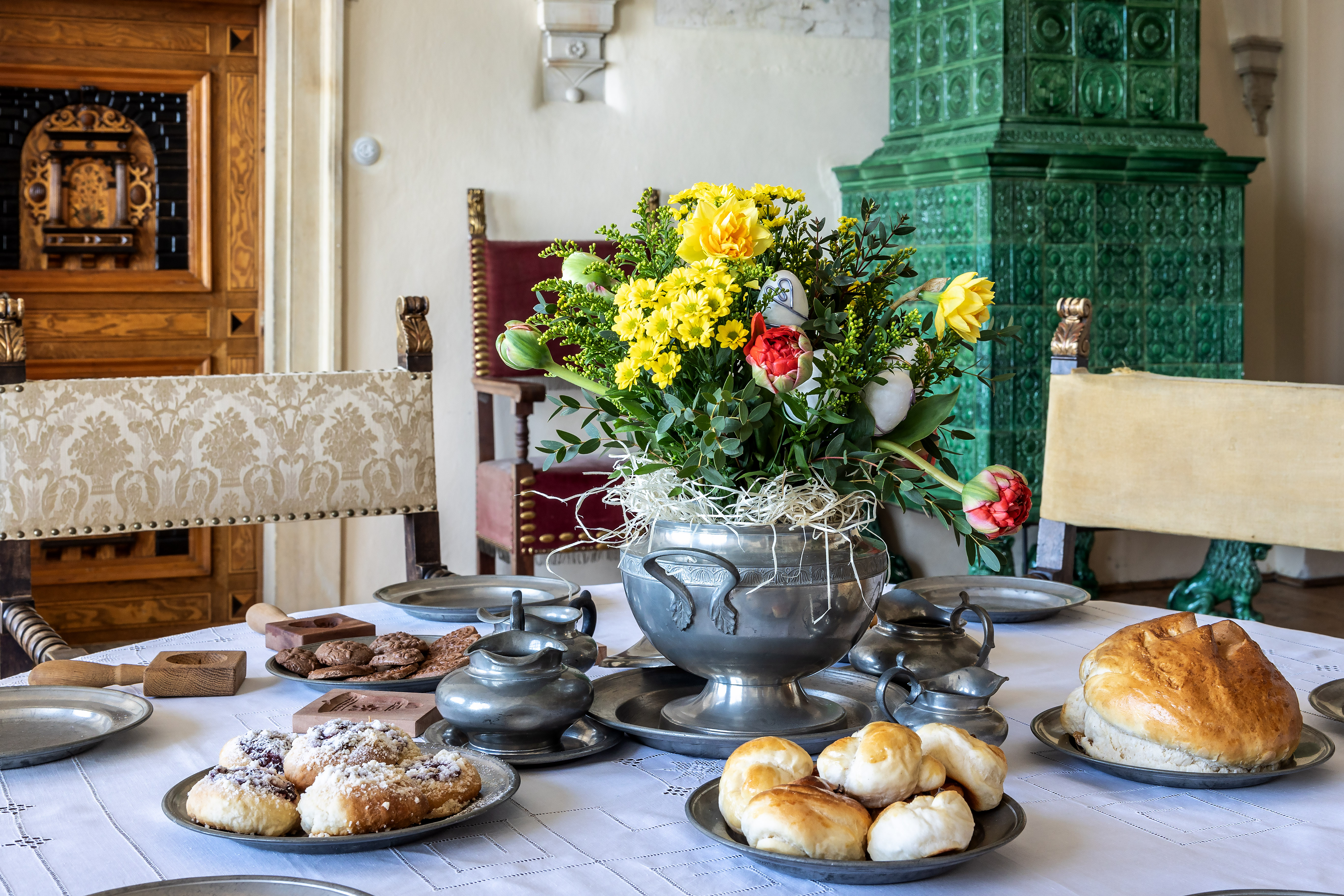 Nejnavštěvovanějším obdobím první části roku jsou Velikonoce. Oblíbené svátky jara nabízejí 4 volné dny, které přímo vybízí k návštěvě památek. Interiéry hradu zdobí velikonoční výstava, kterou v roce 2025 doplnila bohatá květinová výzdoba. Na hradní výzdobu navazuje tematicky laděný výklad průvodců. Součástí velikonočního programu byl dětský tvořivý jarmark a na Velikonoční pondělí jsme našim návštěvníkům pekli tradiční jidáše. Na přelomu května a června zdobily interiéry květinové instalace pivoněk z Hané.