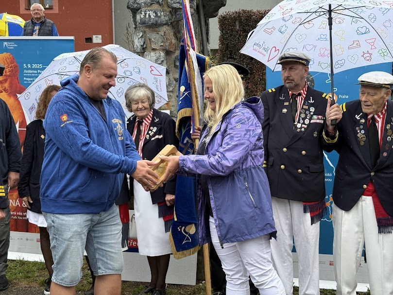 Dovezli tam, společně s kapslí s vodou z vltavských pramenů, hejtmanku Petru Peckovou, poslankyni Věru Kovářovou Železnou a starostku městysu Štěchovice Kateřinu Rožníčkovou, která štafetu předala do rukou starosty městysu Davle Jiřího Prokůpka.