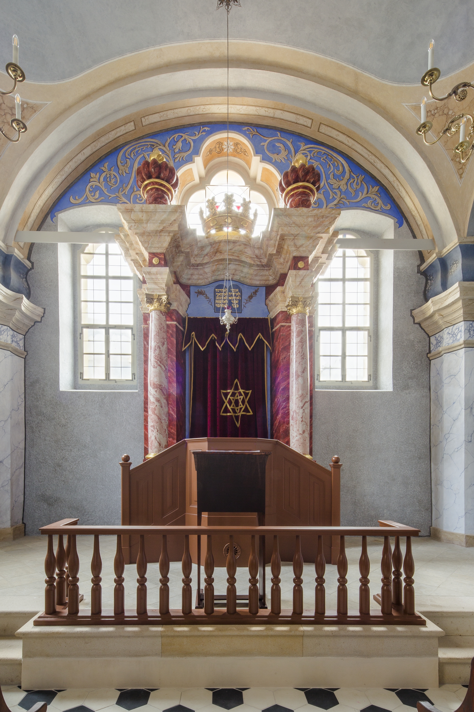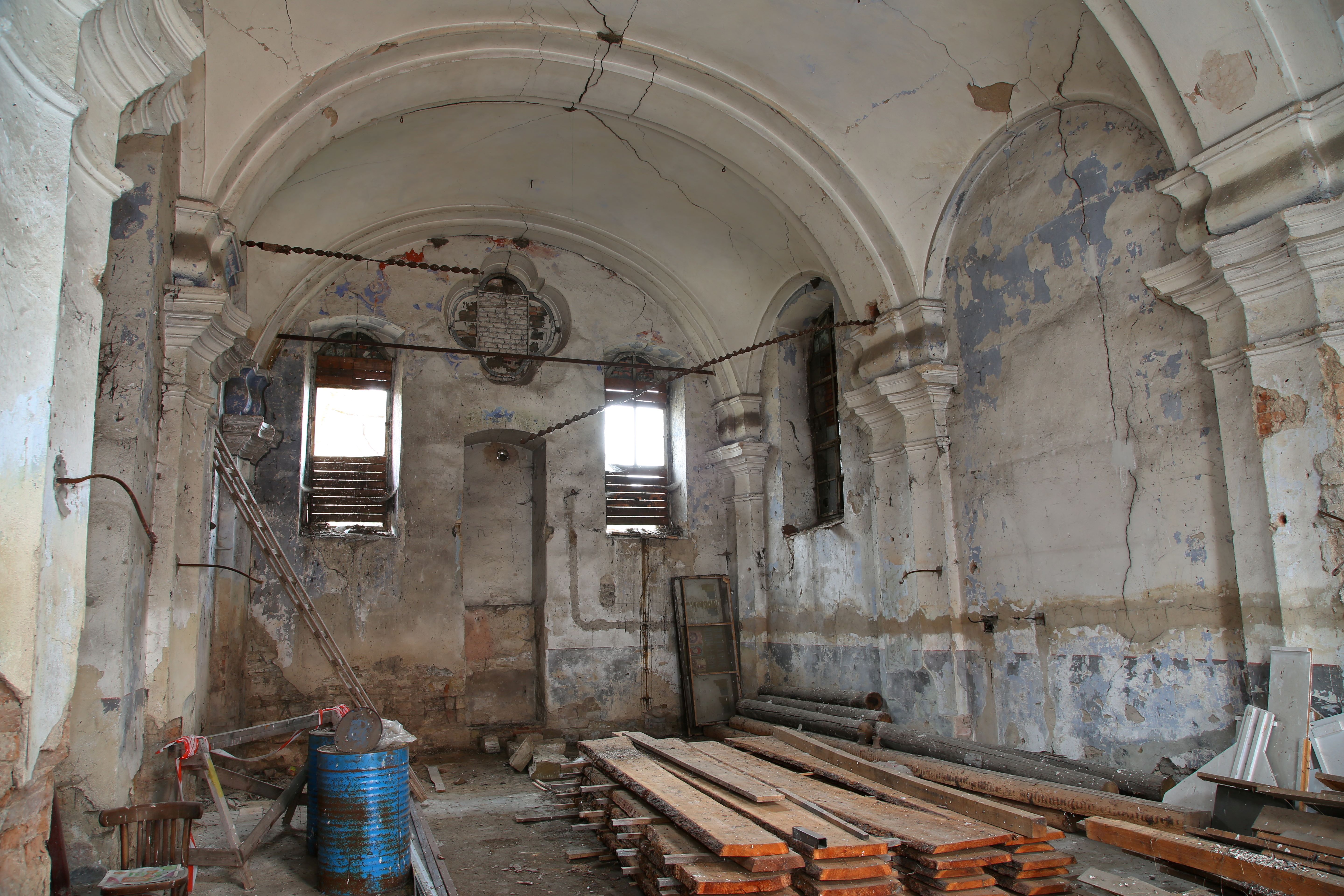 Nedostatek finančních prostředků však tehdy vedl k tomu, že interiér synagogy nebyl v zásadě proveden, chyběly omítky i klenba. Teprve v letech 1825–1826 došlo k zaklenutí interiéru na vnitřní polopilíře, patrně krátce po dokončení kleneb a omítek došlo také k jednoduché výmalbě interiéru.
