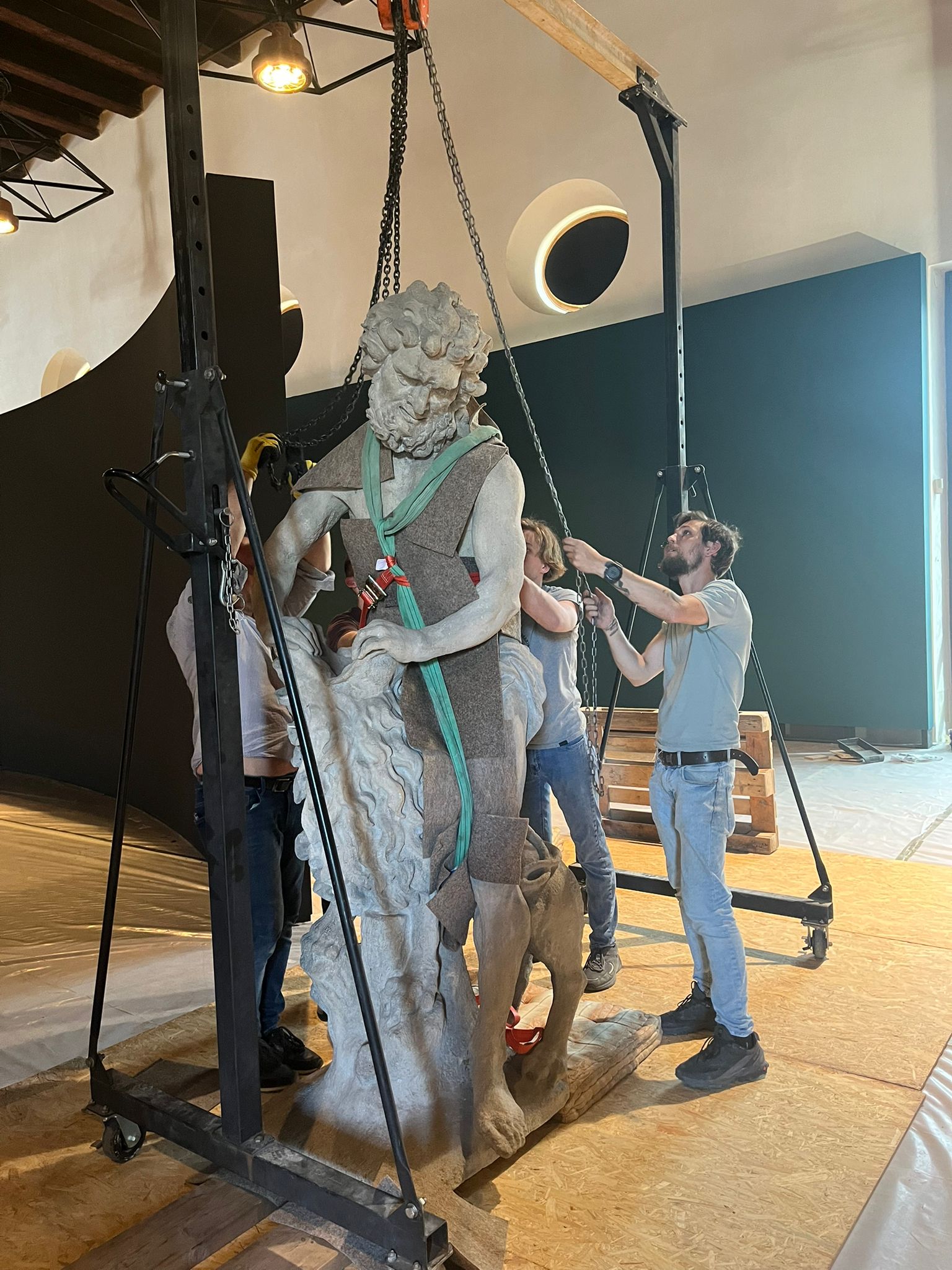 Převoz takto rozměrného a historicky cenného díla si vyžádal důkladnou přípravu a profesionální technické zajištění. Čtyřčlenný tým zkušených restaurátorů pod vedením Jana Kracíka, vedoucího ateliéru restaurování soch Akademie výtvarných umění v Praze, provedl ve středu odborné sejmutí sochy z kamenného podstavce. Pomocí portálového jeřábu a speciálně připravených silonových lan byla plastika bezpečně uložena do vodorovné polohy na transportní lůžko. Během čtvrtka pak dojde k její přepravě do Jízdárny Pražského hradu, kde proběhne její instalace na výstavní podstavec.