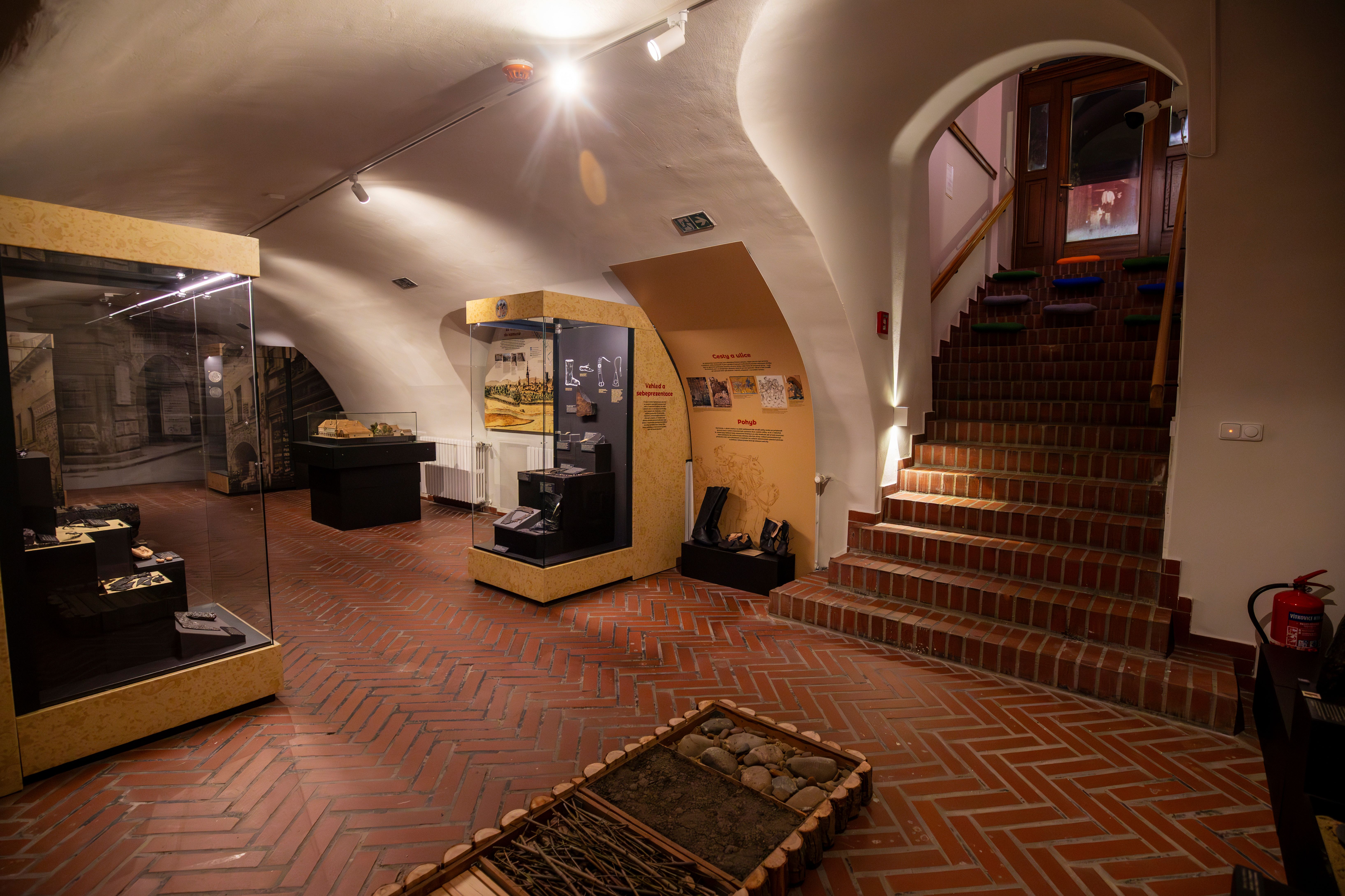 Expozice přibližuje vývoj místa od počátků až po demolici v 60. letech 20. století. Důraz je kladen na středověkou etapu, k níž přinesl archeologický výzkum řadu dokladů. Zajímavostí je mincovní poklad z doby třicetileté války, objevený při odstraňování jednoho z domů. Součástí výstavy je i interaktivní laboratoř, gamebook, herní aplikace k příběhu mincovního pokladu či středověká detektivní hra a noviny přinášející prvorepublikové články o Laubech.