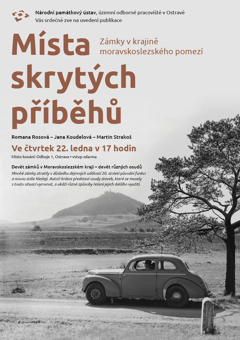 Mnohé zámky ztratily v důsledku dějinných událostí 20. století původní funkci a novou stále hledají. Autoři krátce představí osudy staveb, které se musely s touto situací vyrovnat, a ukáží různé způsoby řešení jejich dalšího využití. Kniha Místa skrytých příběhů. Zámky v krajině moravskoslezského pomezí se podrobněji věnuje devíti zámkům – Chotěbuzi, Kunčicím, Neplachovicím, Staré Vsi nad Ondřejnicí, Kunínu, Hošťálkovům, Janovicím, Bílovci a Dívčímu Hradu. Knihu uvedou autoři Romana Rosová, Jana Koudelová a Martin Strakoš ve čtvrtek 22. ledna v 17 hodin v prostorách ostravského odborného pracoviště Národního památkového ústavu.