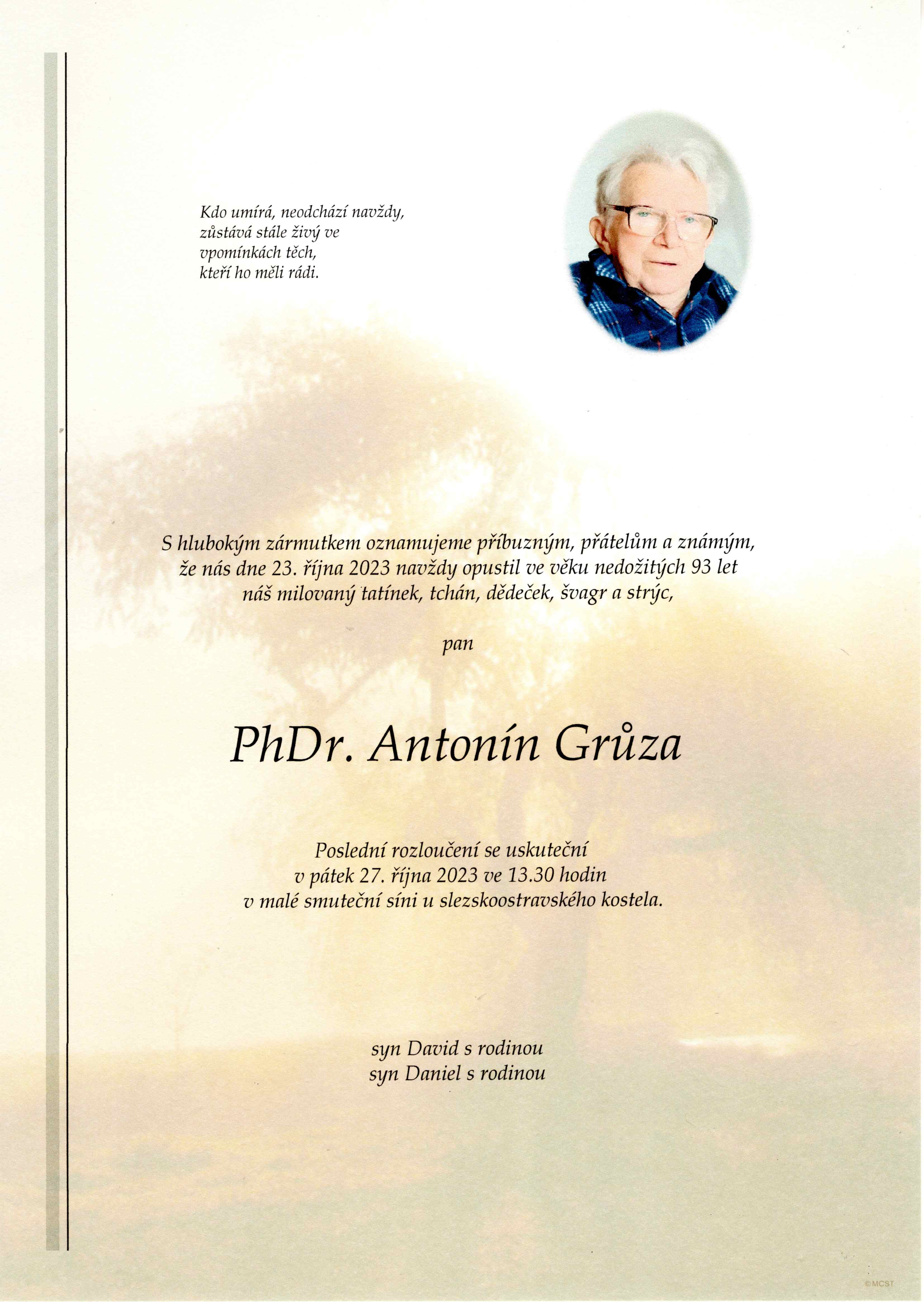 S lítostí oznamujeme, že ve věku nedožitých 93 let zemřel historik umění PhDr. Antonín Grůza. Jeho zásluhou se v NPÚ v Ostravě etabloval archivní průzkum jako součást stavebněhistorických průzkumů. Podílel se na vzniku sborníku pracoviště, byl také členem redakční rady. Spolupráci s NPÚ nepřerušil ani po ukončení pracovního poměru v roce 2005. Do poslední chvíle se živě zajímal o obor. Poslední rozloučení s PhDr. Antonínem Grůzou se uskuteční v pátek 27. října ve 13.30 hodin. Čest jeho památce.