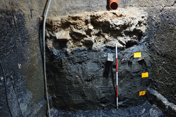 Řez výplní jímky – fekální sediment a zbytky suťového zásypu.