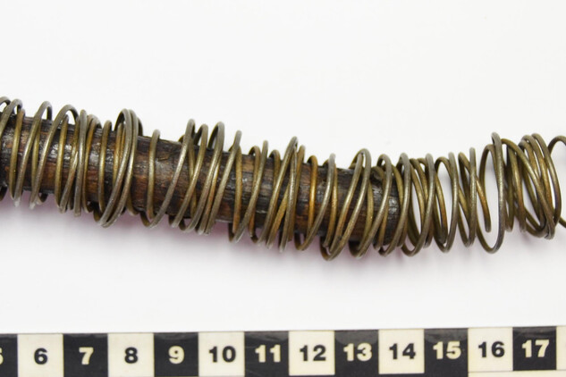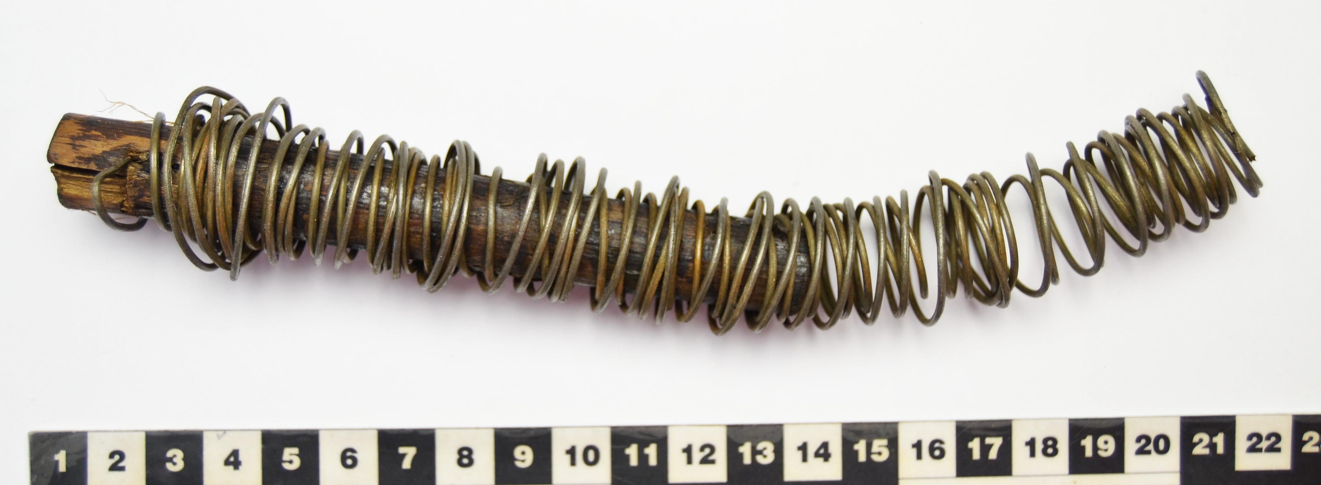 Improvizovaná cívka se dvěma druhy taženého drátu, příklad skladu suroviny – výbavy dílny. Foto: archiv Západočeského muzea v Plzni.