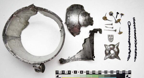 Příklad spektra kovových nálezů: nádoba z tenkého pocínovaného plechu s vypouklým dnem, vpravo nahoře čalounické hřebíčky s ozdobnou pukličkou, hřebíčky, ozdobná kování, řetízky. Foto: archiv Západočeského muzea v Plzni.