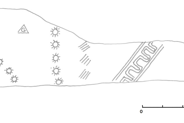Ústřižek usně, který zřejmě sloužil pro zkoušku funkce slepotiskových raznic, pravděpodobně dekor na ozdobnou knižní vazbu. Foto a kresba: J. Figura.