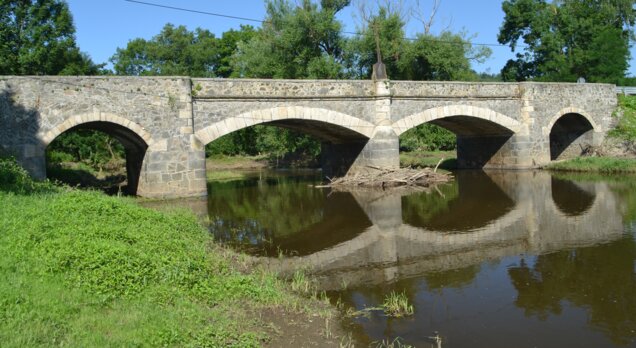 Zděný kamenný silniční most se čtyřmi klenebními oblouky klenoucí se přes řeku Úslavu je datován na podstavci pamětního kříže do roku 1883.