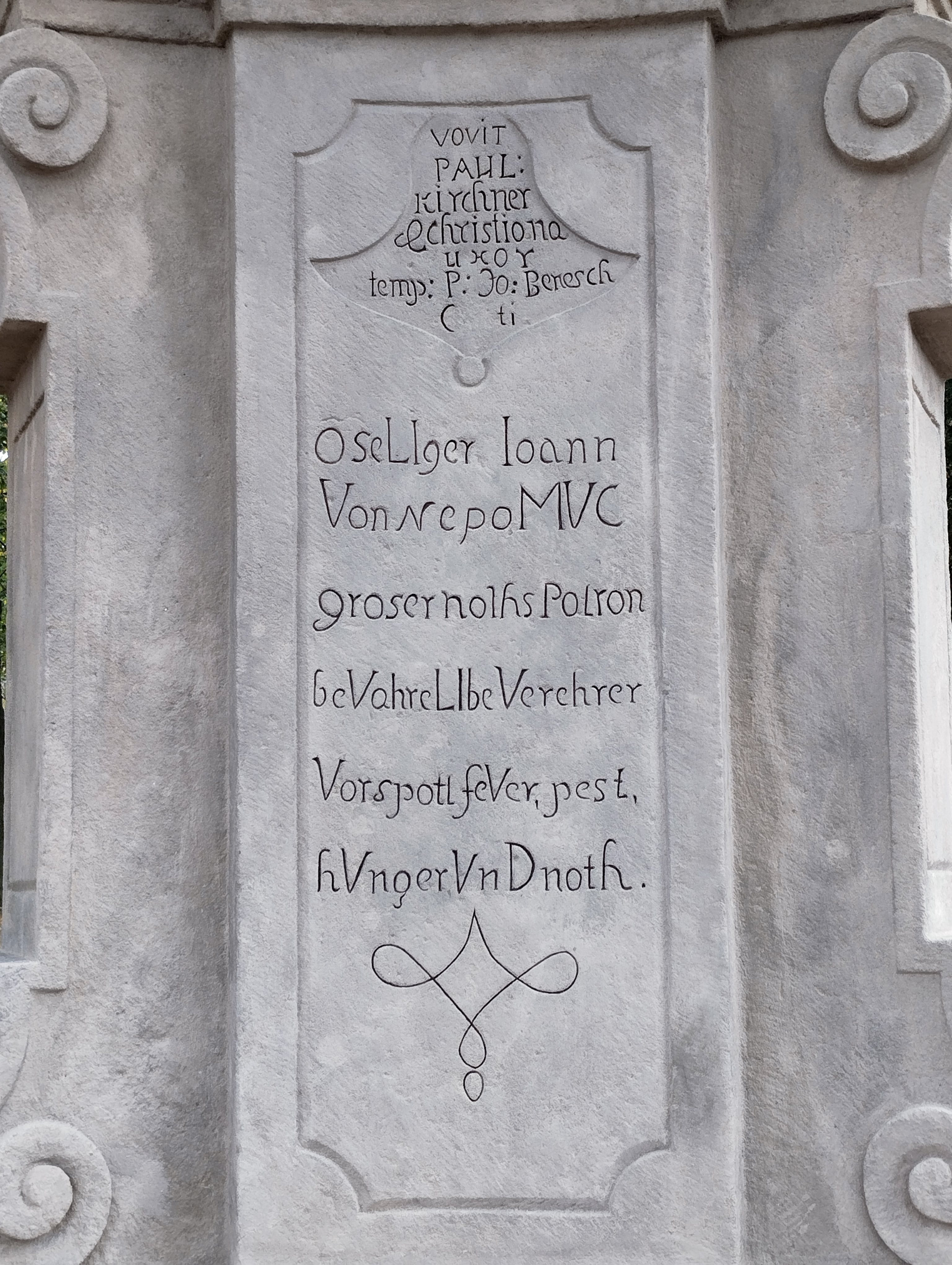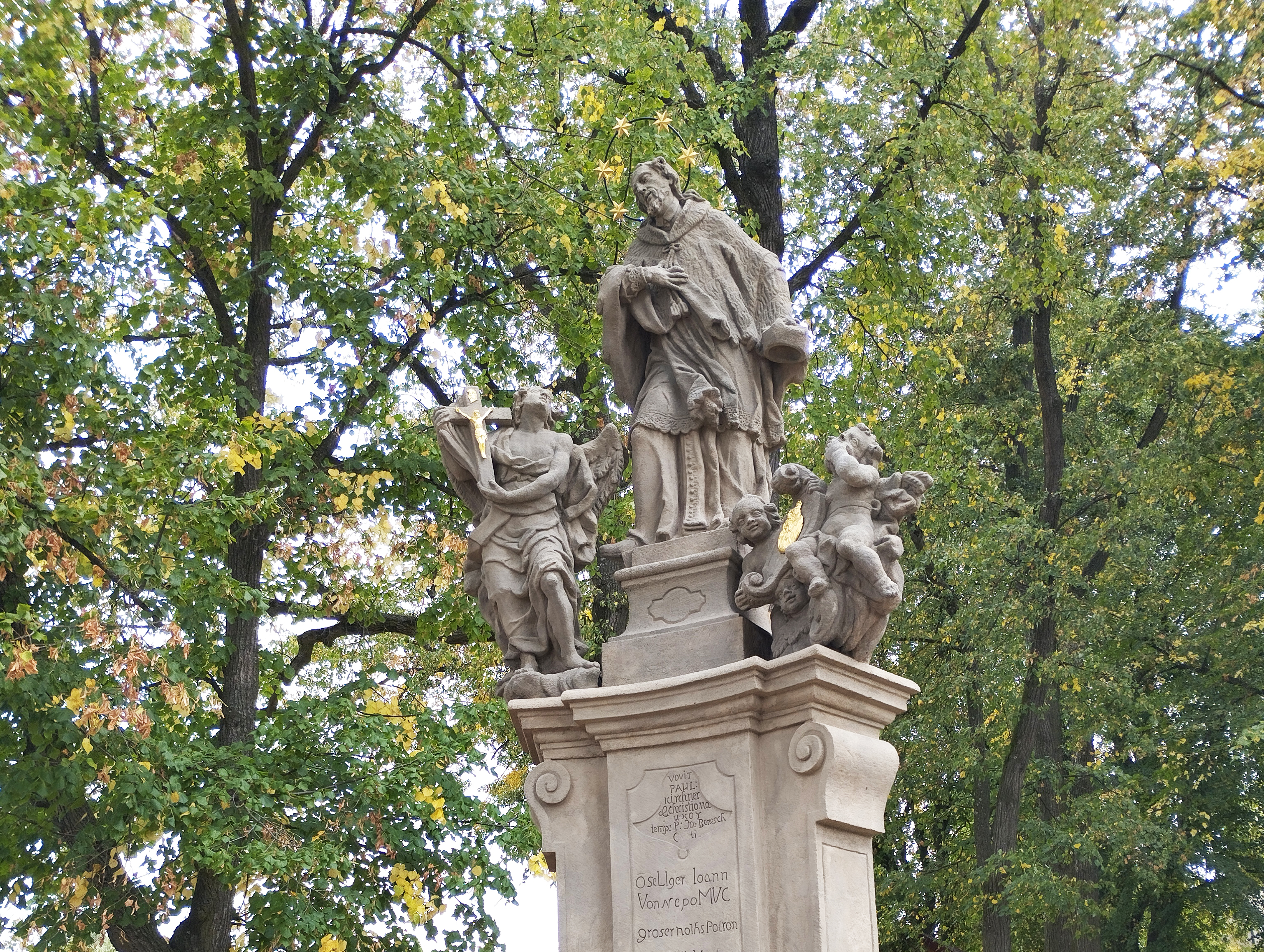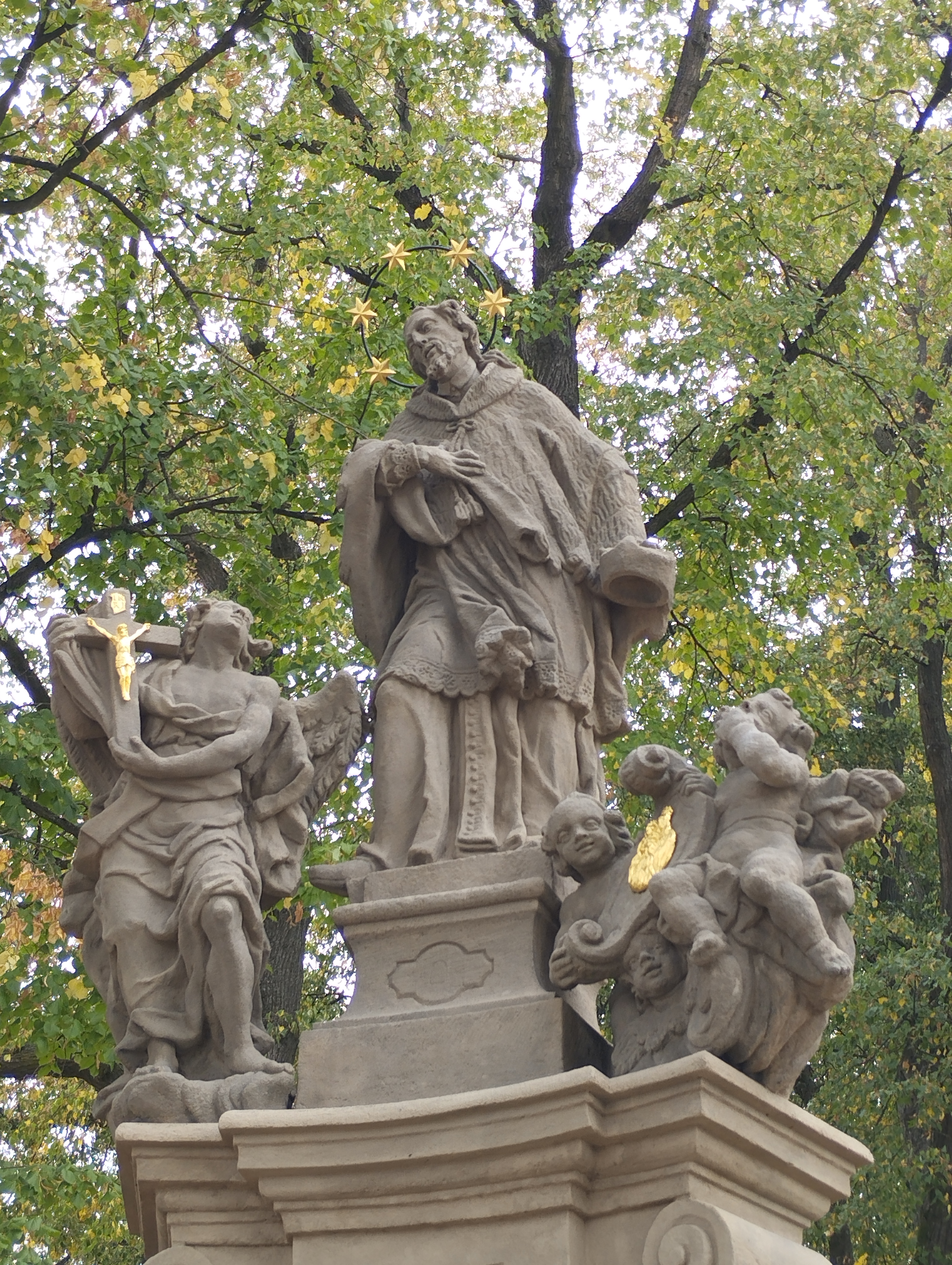 Sousoší znázorňuje sv. Jana Nepomuckého obklopeného několika anděly a stojí na mohutném kamenném podstavci. Jedná se o výrazný příklad vrcholně barokního sochařství. Již v minulosti sousoší prošlo opravami, a to mimo jiné i po nešťastné události, kdy na sebe při nočním návratu domů strhl vandal jednu z andělských soch. Incident si vyžádal jak opravy na poškozené soše, tak lékařské ošetření pachatele. Poškozený anděl tehdy obdržel novou ruku z umělého kamene a další chybějící části byly domodelovány.