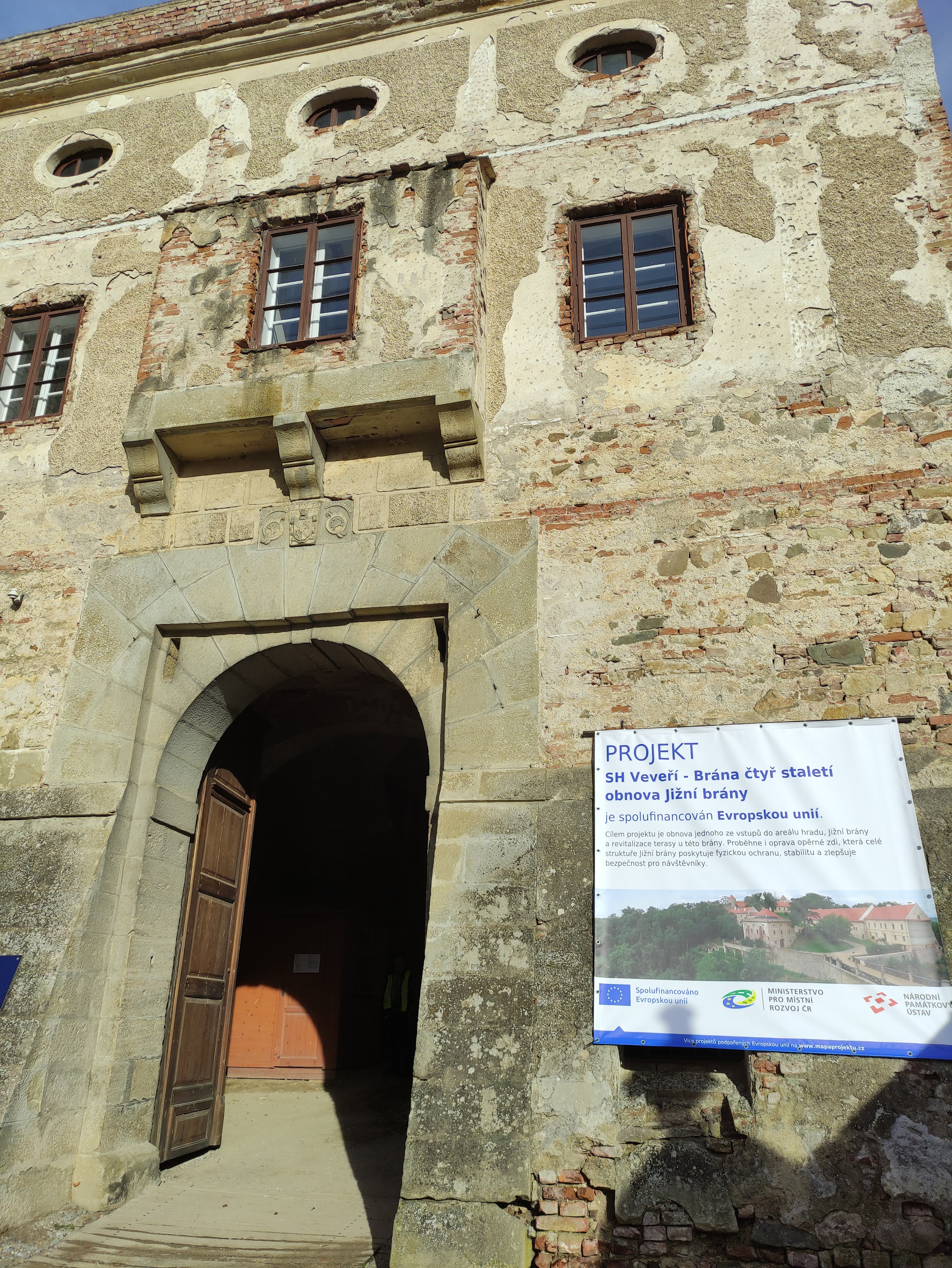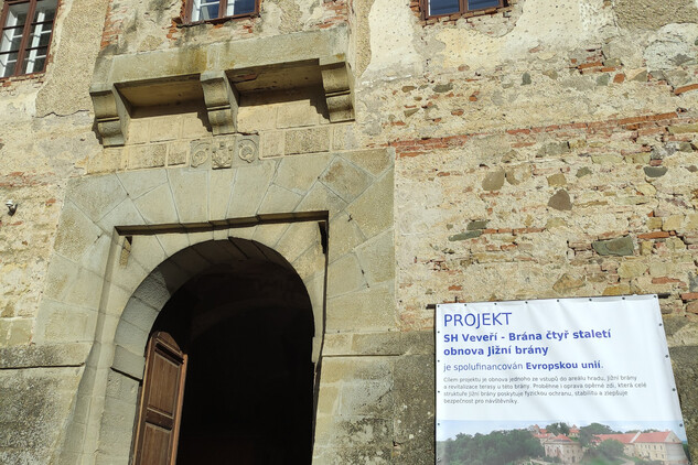 Jižní brána v dnešní podobě vznikla v první čtvrtině 17. století. Tehdejší majitel hradu Zikmund svobodný pán z Tiefenbachu nechal vystavět patrové hranolové stavení s vysokou bránou, které bylo později několikrát upravováno. Jde o jedinečnou ukázku manýristického pevnostního stavitelství na Moravě. Hlavní vstup i menší branka pro pěší bývaly opatřeny padacími mosty, v polovině průjezdu je dochována kapsa pro padací mříž. Na obou průčelích, nad portály, jsou umístěny znakové desky s aliančním erbem Zikmunda z Tiefenbachu a jeho dvou manželek. V 19. století zde vznikl honosný úřednický byt se zázemím, ve 20. letech minulého století byla část přízemí upravena na pokladnu. Na tuto funkci navazuje i současný projekt. Po dokončené revitalizaci bude přízemí sloužit jako vstupní prostor s pokladnou, úschovnou zavazadel a dvěma místnostmi pro expozice. Zůstane zde i vodárna pro hradní areál. V prvním patře vznikne návštěvnické centrum s expozicí a toaletami, na přilehlém dvorku klidová zóna s posezením a výhledem na hradní jádro.