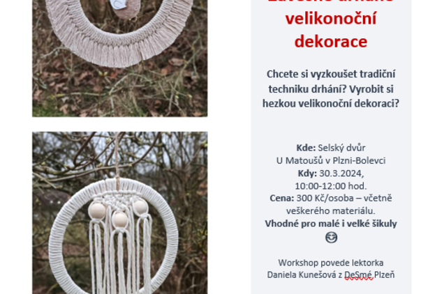Workshop povede lektorka Daniela Kunešová z DeSmé Plzeň. Její výrobky se budou zároveň prodávat i na Velikonočním jarmarku.