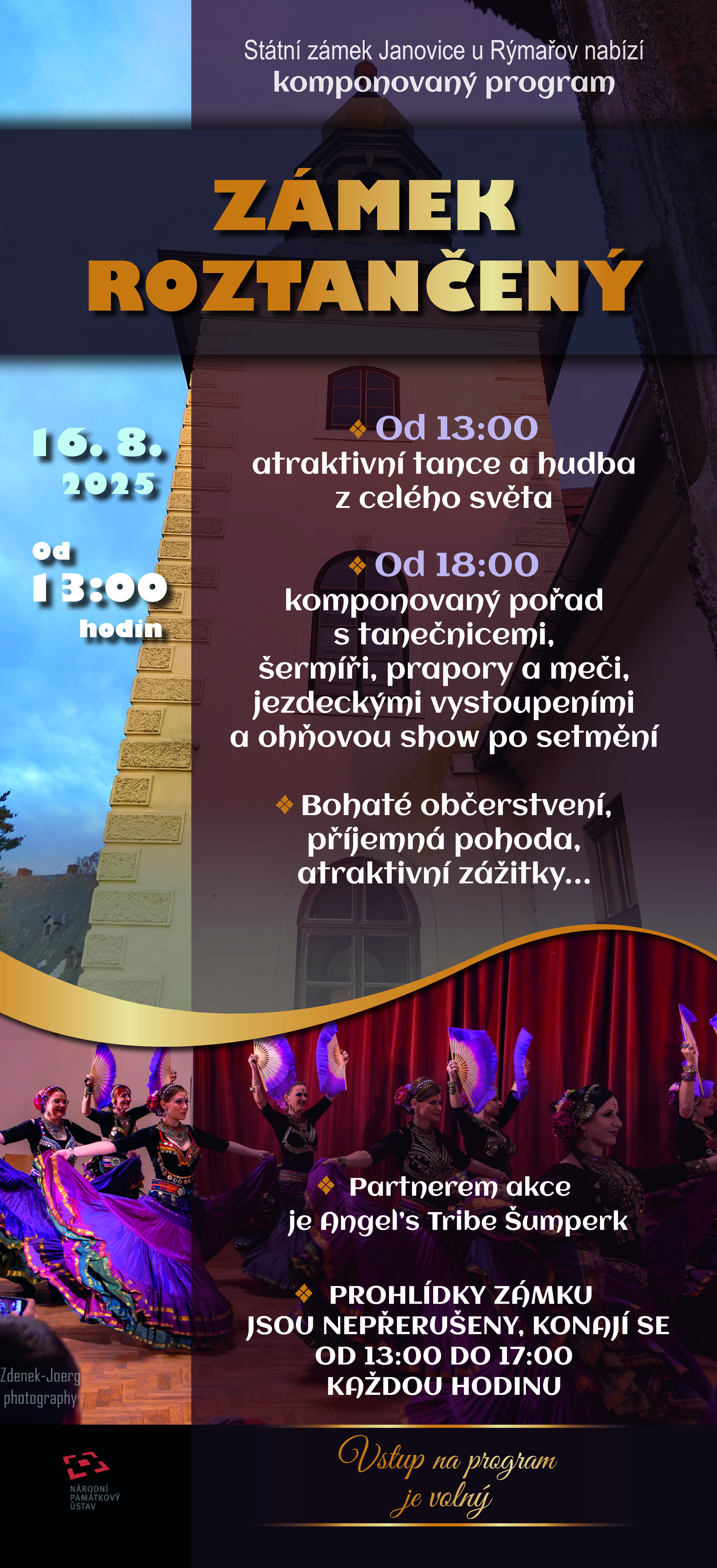 V sobotu 16. srpna 2025 bude celý janovický „Zámek roztančený“. Atraktivní program tanečnic začne brzy odpoledne a hlavní komponovaný pořad s tanečnicemi, šermíři, praporečníky, jezdeckými vystoupeními a ohňovou show po setmění začíná v 18:00.