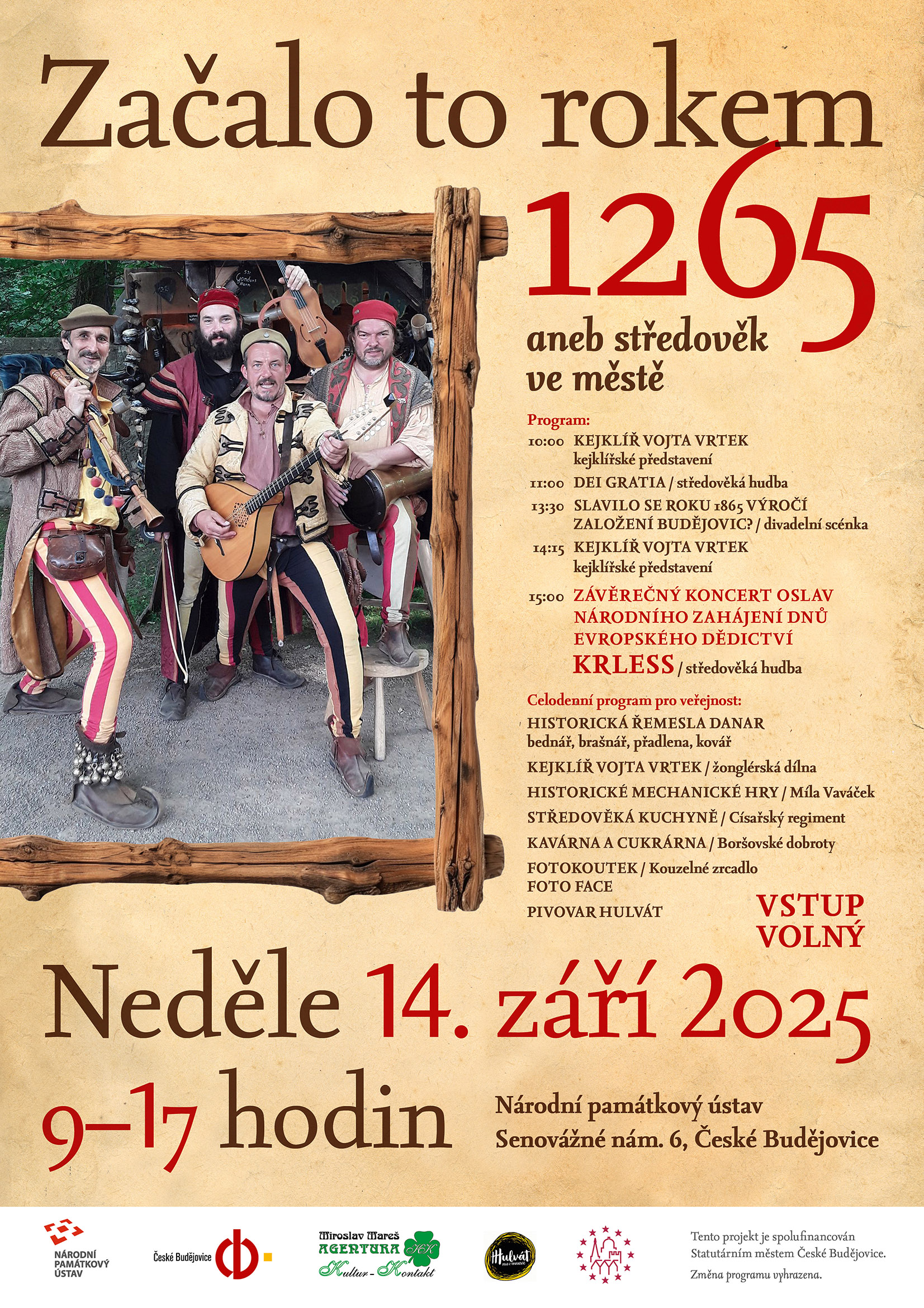 V neděli 14. září 2025 ožijí České Budějovice středověkem. Bývalé povoznictví U Ferusů se promění v místo plné hudby, vůní, řemesel, žonglérů a her. Národní památkový ústav zde pro veřejnost připravil celodenní program s názvem „Začalo to rokem 1265 aneb středověk ve městě“, který je součástí Národního zahájení Dnů evropského dědictví.