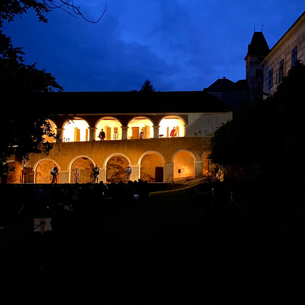 Večer otevře původní divadelní hra „Rytířova dcera“ v podání divadelního spolku Bouček – výpravný příběh o odvaze, touze po svobodě a síle jít proti osudu. Emotivní inscenace rozehraje arkády a zahradu zámku ve 20:30.