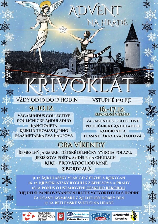 Po oba víkendy se děti zabaví (nejen) výrobou tradičního polazu a budou moci odeslat dopis Ježíškovi přímo z křivoklátské Ježíškovy pošty. V sobotu 16. prosince se všichni návštěvníci mohou zapojit do vytvoření nového českého rekordu "Nejdelší papírový vánoční řetěz vytvořený za 6 hodin" pod bedlivým dohledem komisaře z agentury Dobrý den. A kdo by si chtěl z Křivoklátu odnést pravé a nefalšované betlémské světlo, bude mít příležitost po celou neděli 17. prosince.