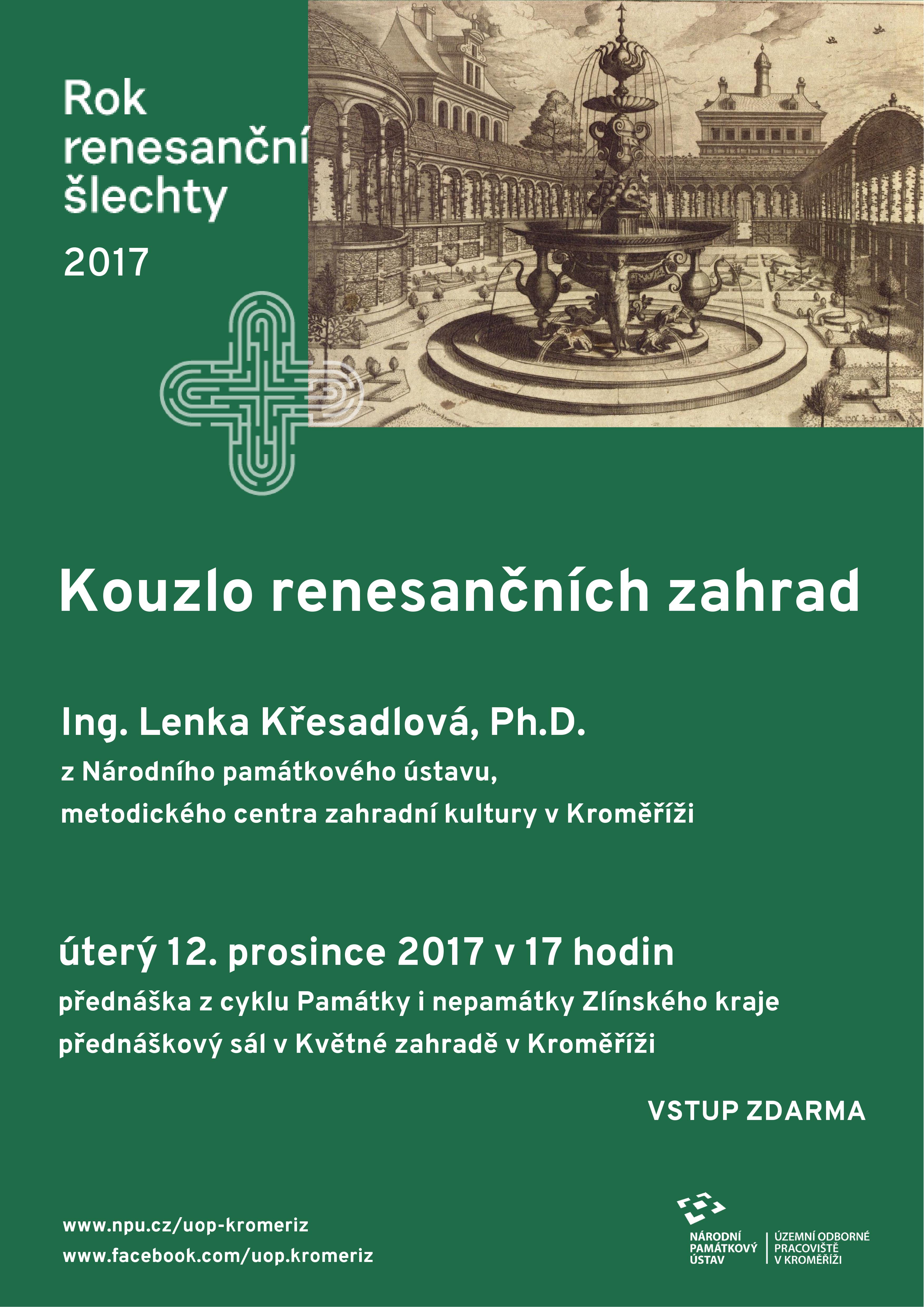 Přednášející: Ing. Lenka Křesadlová, Ph.D., specialistka na památky zahradního umění z Národního památkového ústavu, metodického centra zahradní kultury v Kroměříži.