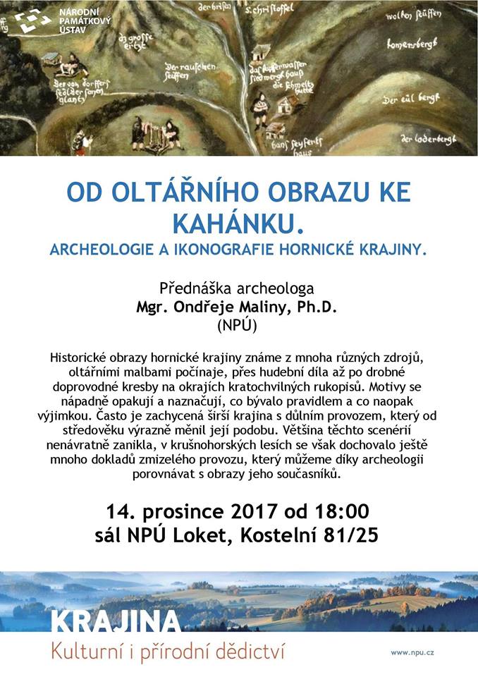 Četná vyobrazení středověkého hornictví v rukopisech odborných děl či na deskových malbách i oltářních obrazech prozrazují mnohé o používání hornických nástrojů i postupů, na druhou stranu obsahují i fantaskní výjevy. Otázkou je, nakolik středověký umělec zobrazil realitu a co již patří do oblasti jeho „umělecké licence“. Odpověď může přinést porovnávání středověkých vyobrazení s archeologickými nálezy, jak přiblíží ve své přednášce archeolog Mgr. Ondřej Malina, Ph.D., z NPÚ v Lokti. Na jeho přednášku vás zveme ve čtvrtek 14. 12. 2017 od 18 hodin do přednáškové místnosti NPÚ v Kostelní ulici 81/25 v Lokti.