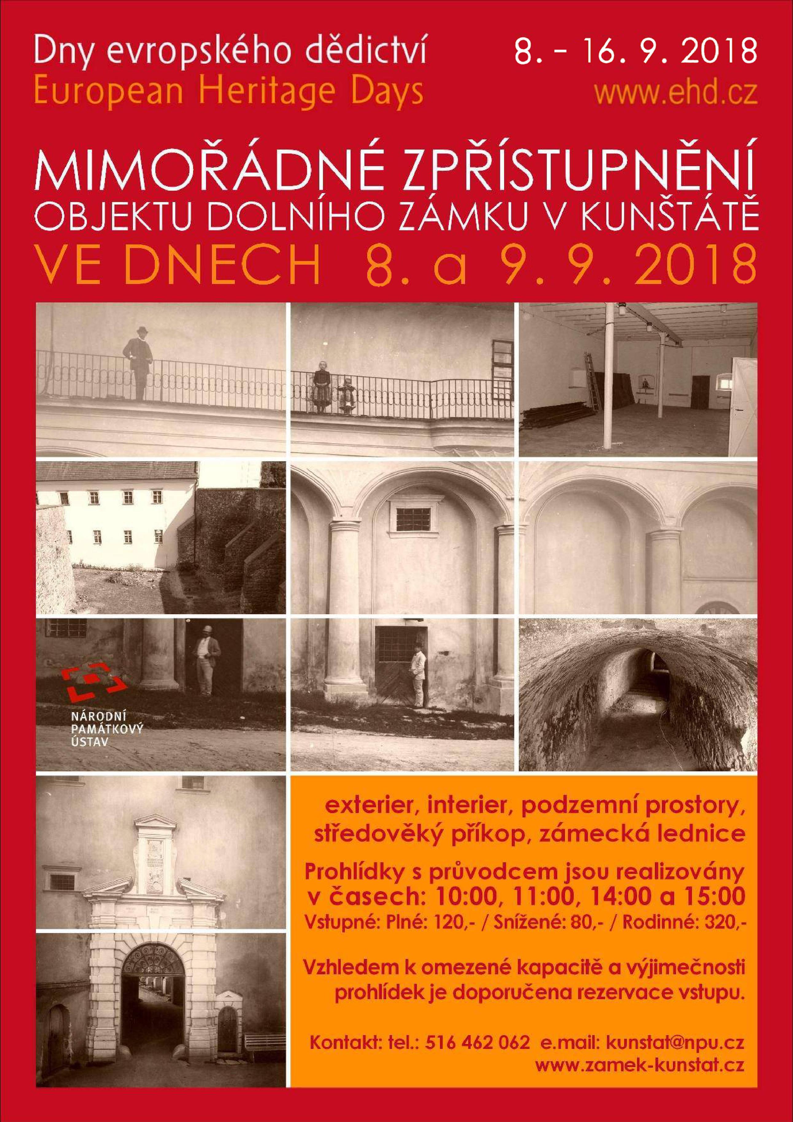 A opět jako každý rok v rámci Dnů evropského dědictví bude 8. a 9. září zpřístupněn objekt tzv. Dolního zámku v Kunštátě. O tomto víkekndu na vás čeká osm vyjímečných prohlídek (oba dva dny v 10: 00, 11: 00, 14:00, 15:00), při kterých se můžete projít zámeckým sklepením, příkopem, středověkou lednicí, vystoupáte přes zámecké divadlo až k hodinovému stroji a tím to nekončí.