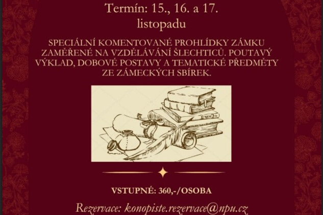Na víkend 15., 16. a pondělí 17. listopadu je připravená mimořádná prohlídka, věnovaná vývoji studií s leckdy až kuriozními zajímavostmi. Výjimečně se naskytne příležitost prohlédnout si učební pomůcky dětí arcivévody Františka Ferdinanda d´Este. Dozvíte se také, jakou výuku absolvovaly děti v šlechtických rodinách a jak výuka probíhala.