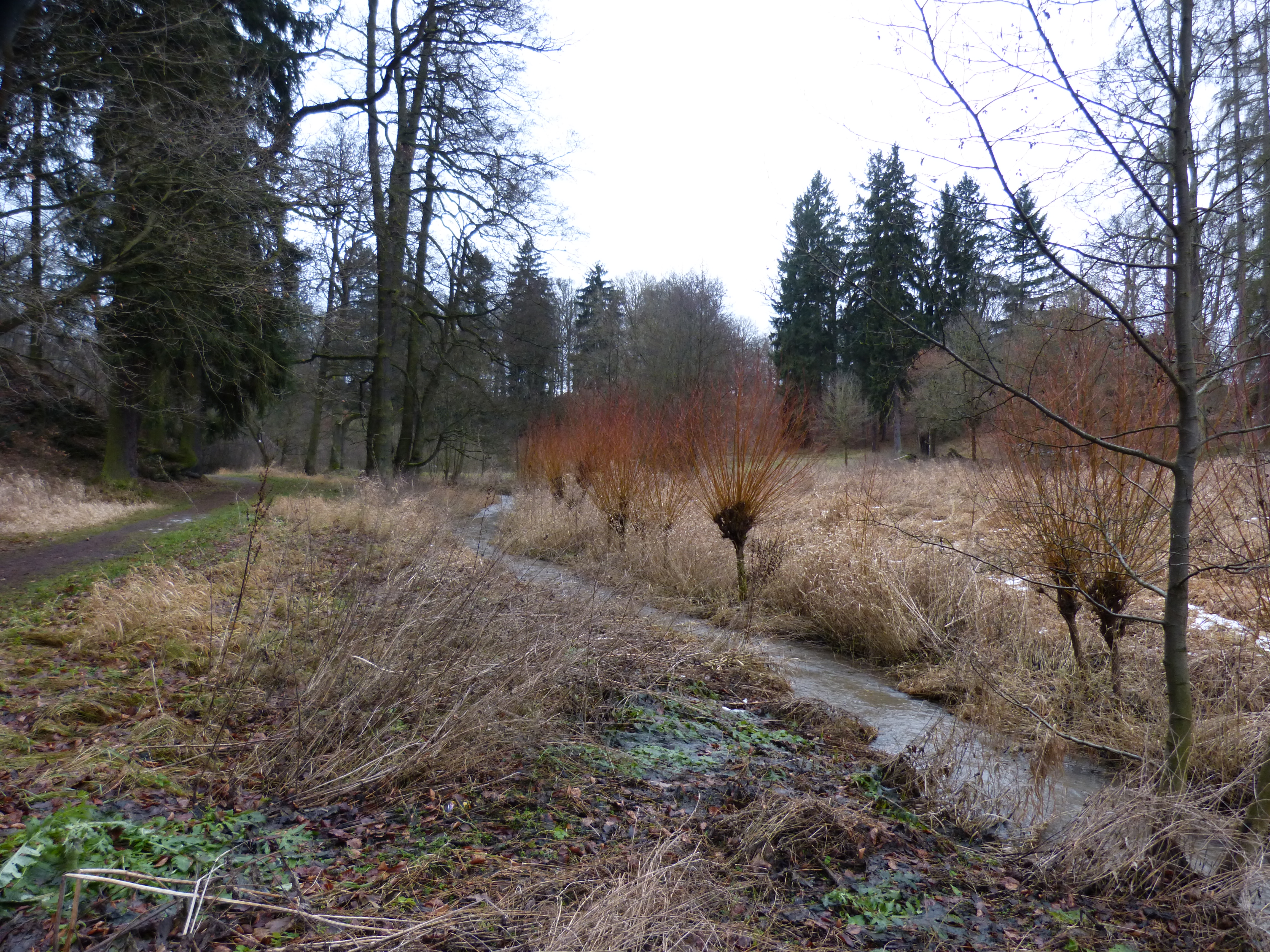 První část stezky je ve spodním parku. V této části stezky je označeno 40 dřevin. Dřeviny jsou to nejen základní, které mají široké využití v dřevařském průmyslu (javor klen, borovice lesní, lípy…), ale i při výrobě uměleckých předmětů (klokoč zpeřený, tis obecný…). Stezka začíná u vstupu do parku jižním vchodem naproti bývalé policii u památného javoru klenu, jehož stáří se odhaduje něco přes 220 let (stejný je i naproti Vdovskému domu). Dále pokračuje kolem rybníka k zámeckému zahradnictví, pak ke škole a zpět z rybníku přes bílý most.