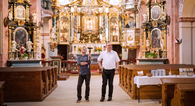 Autoři knihy, Michal Tryml a Zdeněk Dragoun, během poslední fáze výzkumu v chaberském kostele (foto M. Pavýza, 2014)