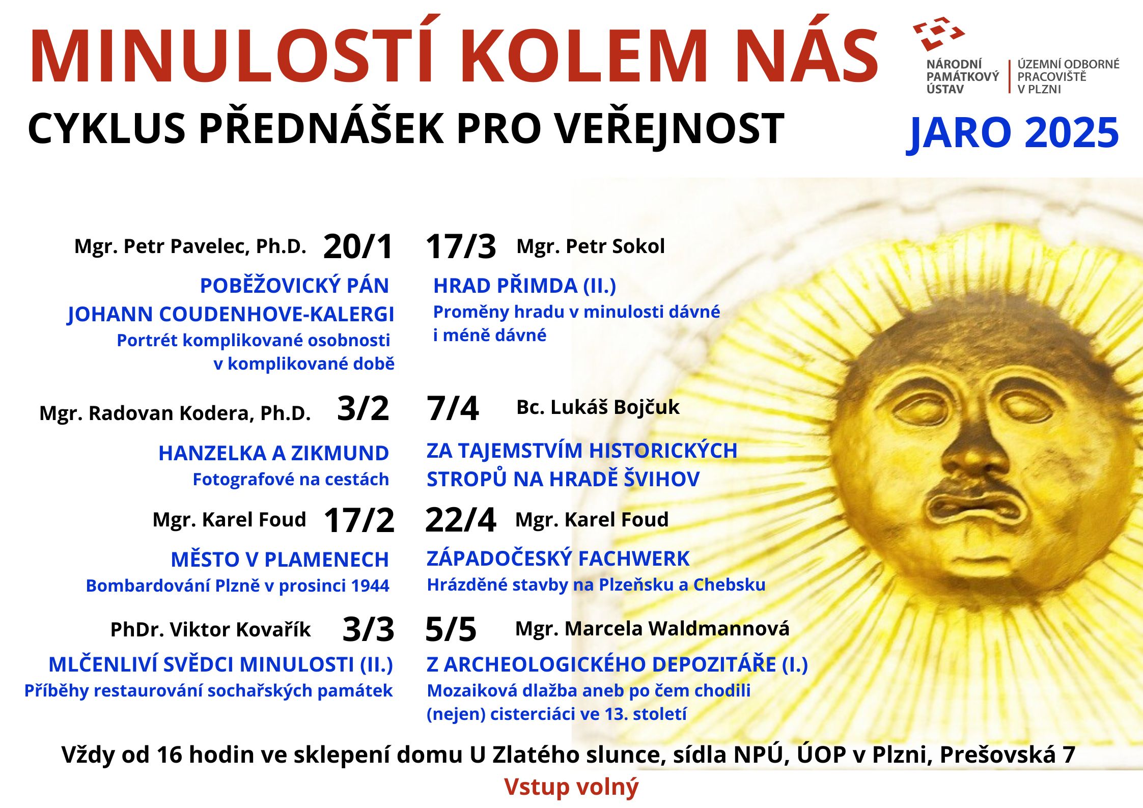 V roce 2025 bude již v lednu zahájen 3. ročník přednáškového cyklu, který územní odborné pracoviště NPÚ v Plzni pořádá. Stejně jako samotný obor památkové péče je i tematická skladba přednášek pestrá a široká. Přednášky mají populárně naučnou formu, takže nejsou určeny jen pro odborníky z oboru, ale pro všechny, kdo mají zájem dozvědět se něco zajímavého z naší historie. Přednášejícími jsou jak památkáři pracoviště, tak i hostující odborníci. Vedle představení restaurovaných sochařských děl a nastínění vývoje hradu Přimda, které zazní ve svém druhém pokračování, se mohou posluchači těšit například na fotografie z cest známých cestovatelů Hanzelky a Zikmunda, dozví se o následcích bombardování Plzně před osmdesáti lety, mohou se dozvědět o tajemství mimořádných renesančních stropů, které se restaurovaly na hradě Švihov, seznámí se s tzv. fachwerkem, tedy hrázděnou lidovou architekturou, a budou moci „nahlédnout“ do archeologického depozitáře pracoviště, kde se ukrývají např. i unikátní románské dlaždice. První přednáška v novém roce, která se uskuteční již 20. ledna, se bude věnovat excentrickému aristokratovi Johannu Coudenhove-Kalergimu, někdejšímu majiteli zámku Poběžovice, který byl synem hraběnky Micuko, jedné z vůbec prvních Japonek, které se přistěhovaly do Evropy.