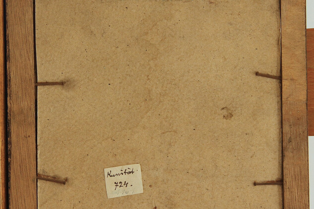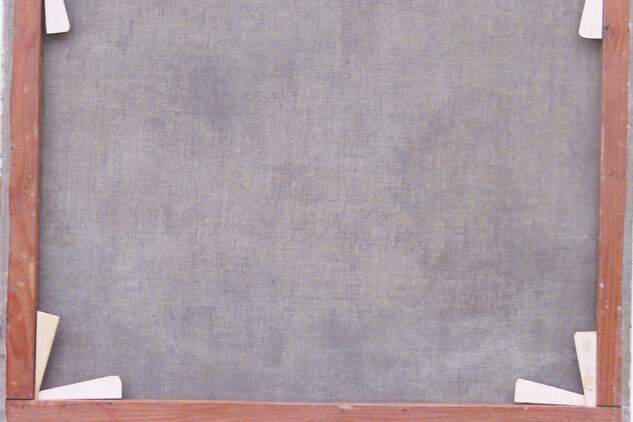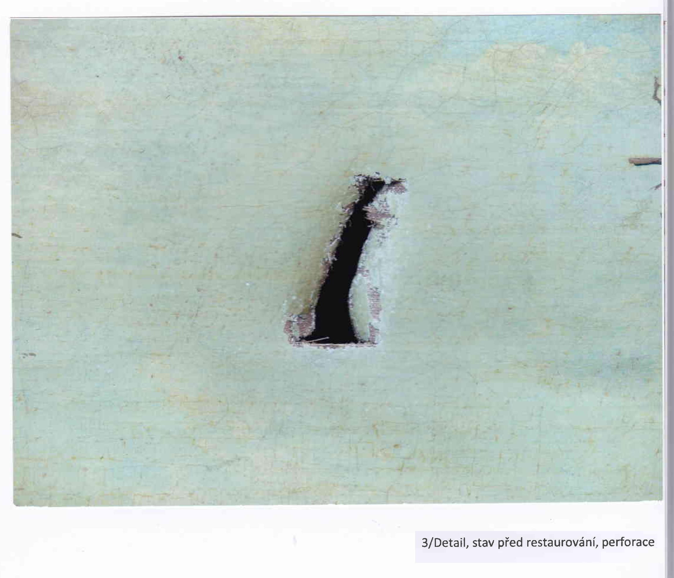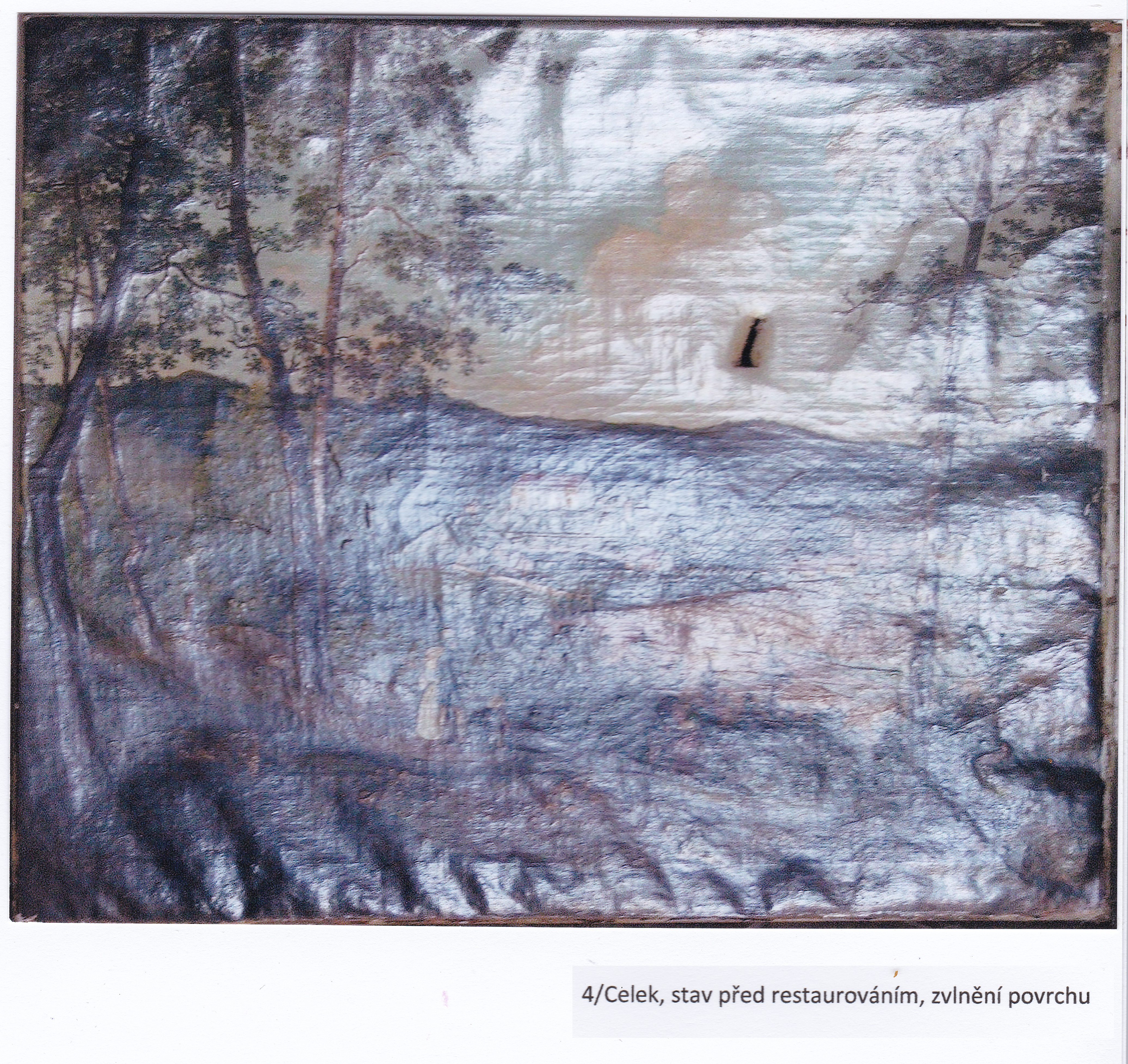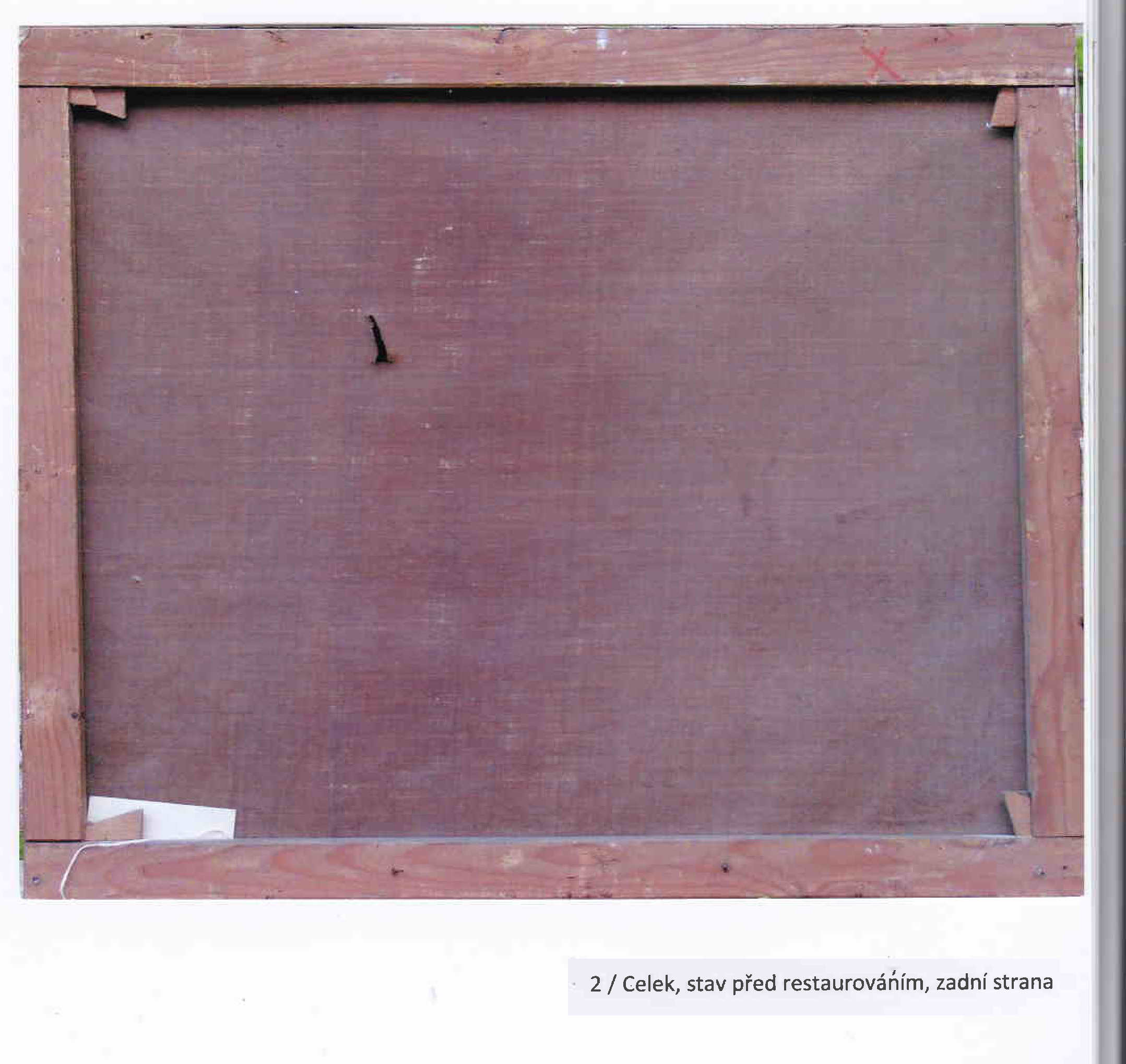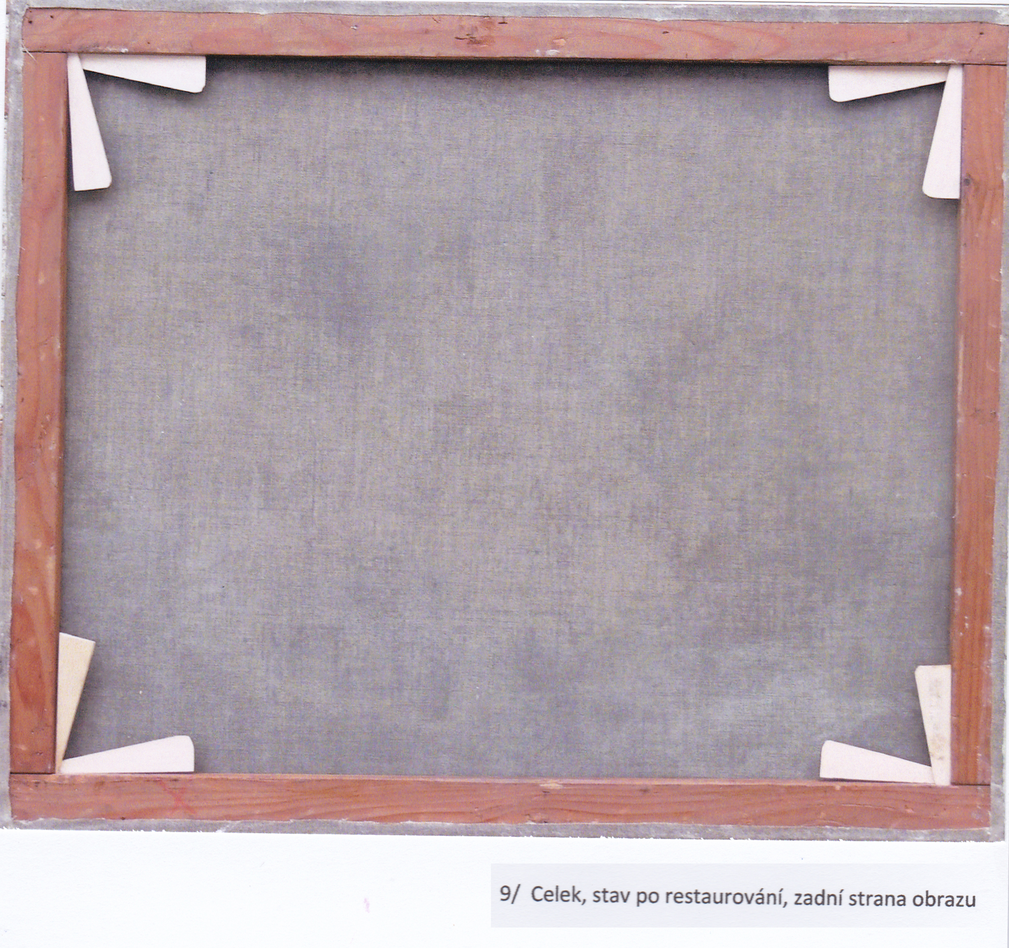 Plátno je prověšené, zvlněné, na jednom místě protržené v délce 6cm. Celkový úbytek barevné vrstvy je možno odhadnout na 15cm2. Obraz je ve špatném stavu; prověšení plátna, zvlnění, labilní lpění barevné vrstvy na podložce. Ztmavnutý lak si vyžaduje nezbytný restaurátorský zásah, který obrazu navrátí integritu hmotné a estetické podstaty.