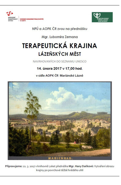 Národní památkový ústav v Lokti, ve spolupráci s Agenturou ochrany přírody a krajiny České republiky v Mariánských Lázních, zve všechny zájemce z řad široké veřejnosti na přednášku Mgr. Lubomíra Zemana "Terapeutická krajina lázeňských měst navrhovaných k zápisu na Seznam světového kulturního a přírodního dědictví UNESCO". Těšíme se na vás v úterý 14. února 2017 od 17 hodin v sídle Agentury ochrany přírody a krajiny České republiky v Mariánských Lázních, Hlavní třída 504/41. Vstup je volný.
