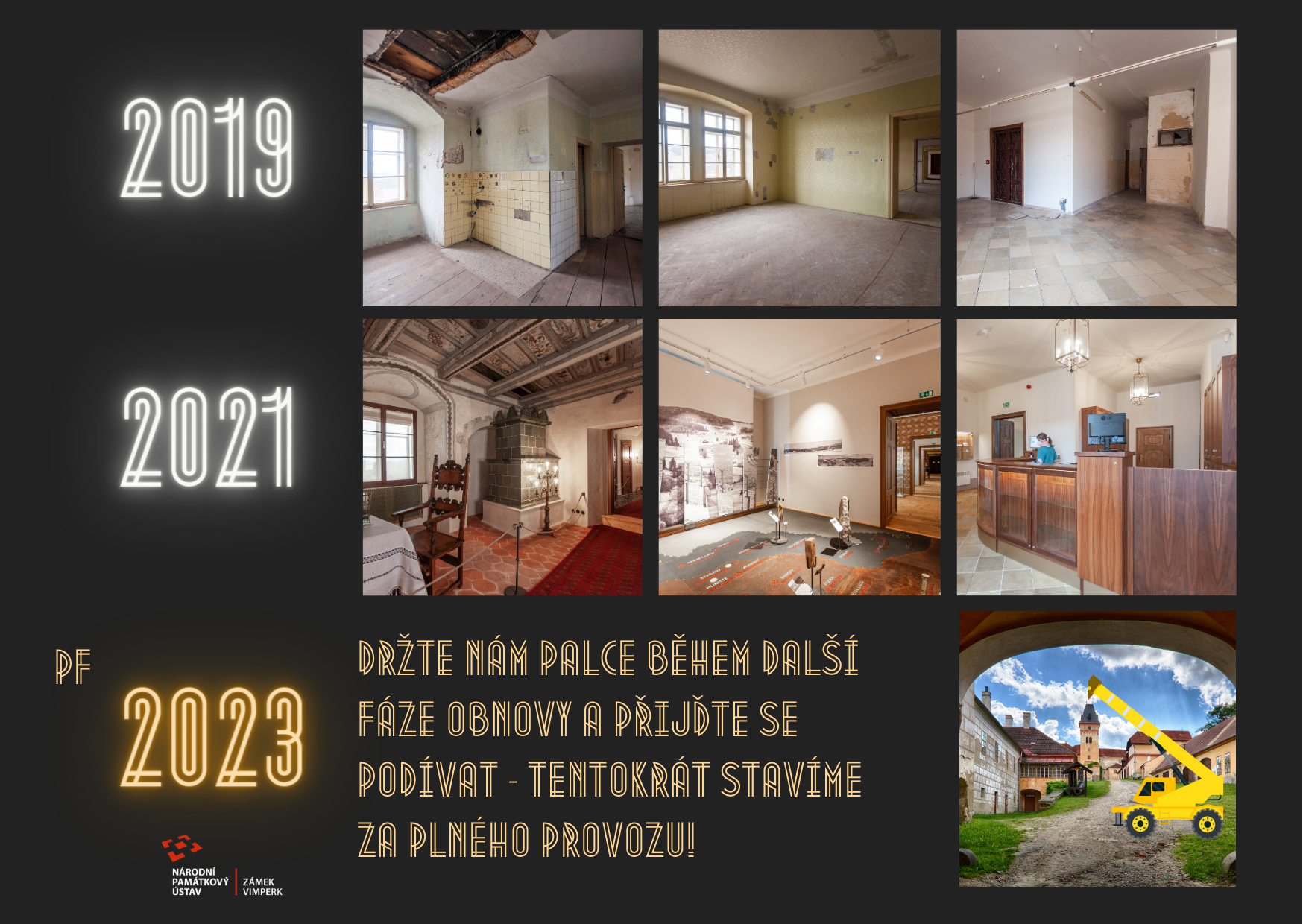 Vimperský zámek čeká po krátké pauze další stavební sezóna – vstupuje totiž do další fáze "Probouzení zimního zámku". Tentokrát však stavební práce poběží za plného provozu. Jejich postup tak budete moci zahlédnout na vlastní oči. Budeme se těšit na každou Vaši návštěvu!