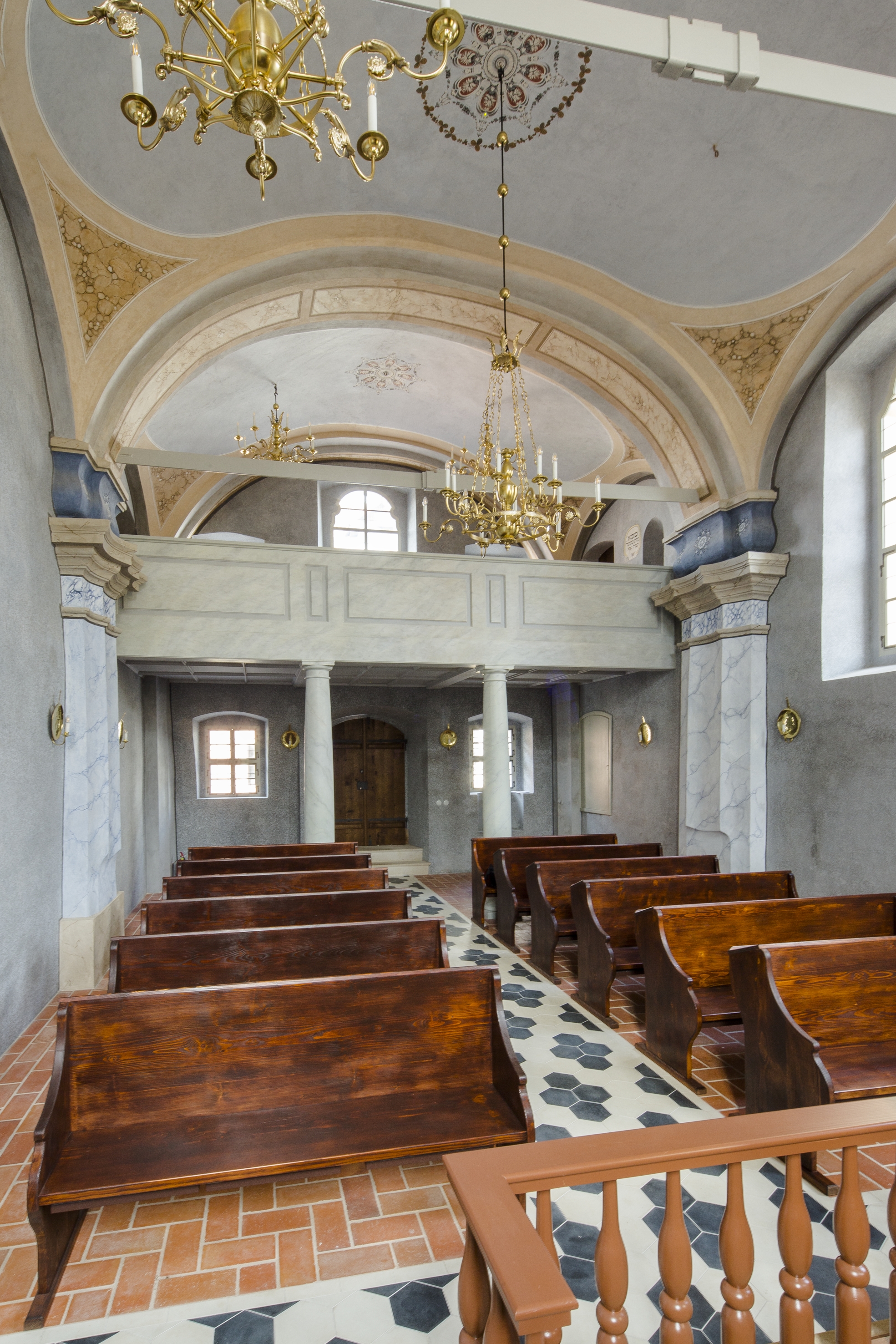 Nedostatek finančních prostředků však tehdy vedl k tomu, že interiér synagogy nebyl v zásadě proveden, chyběly omítky i klenba. Teprve v letech 1825–1826 došlo k zaklenutí interiéru na vnitřní polopilíře, patrně krátce po dokončení kleneb a omítek došlo také k jednoduché výmalbě interiéru.