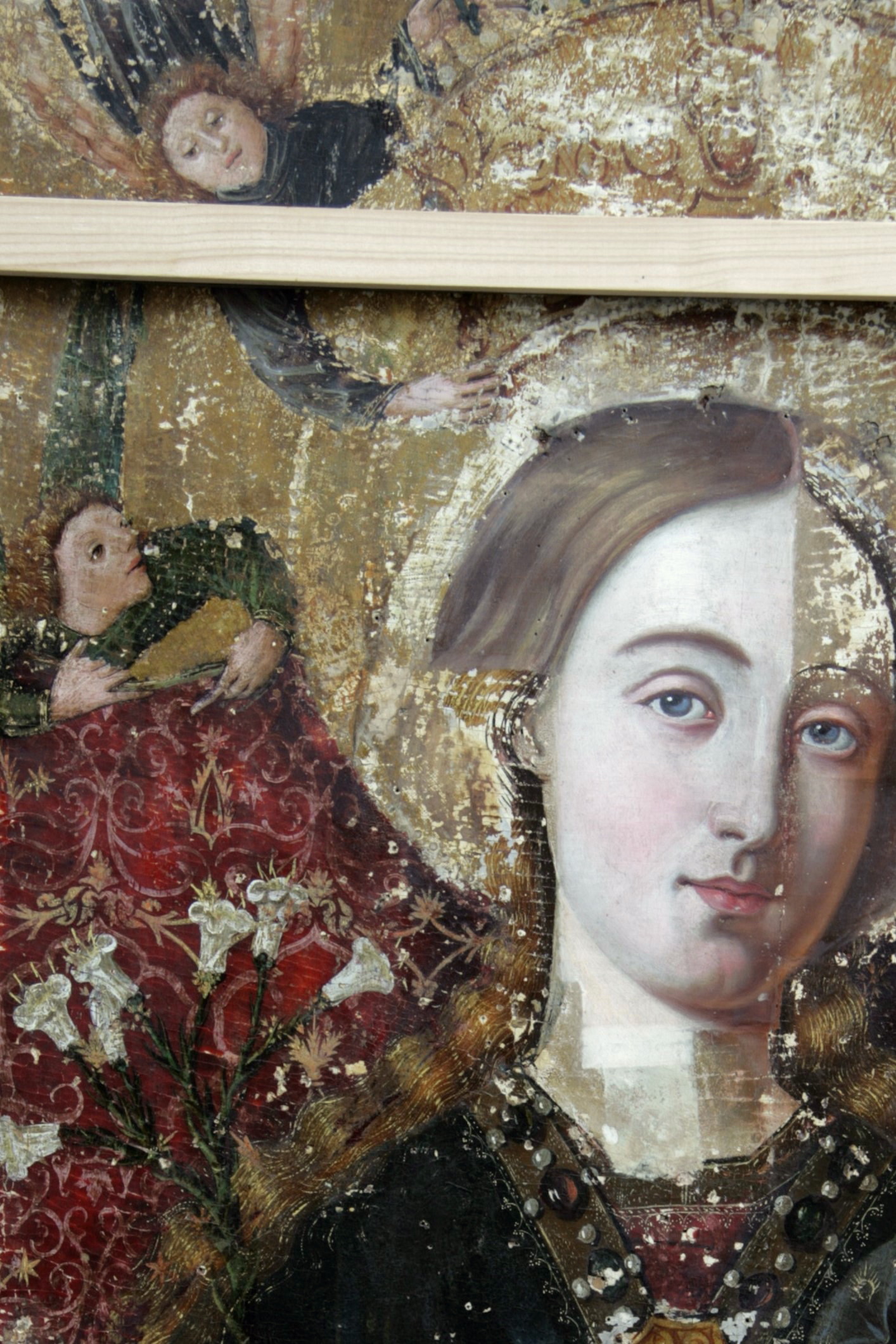 Novověké textilní, papírové a kovové aplikace musely být umístěny na novou desku, jež je kopií dřevěné středověké podložky s barevnou vrstvou malby z 19. století. Tento obraz byl po sestavení a zarámování umístěn zpět do kostela v Těrlicku-Kostelci.