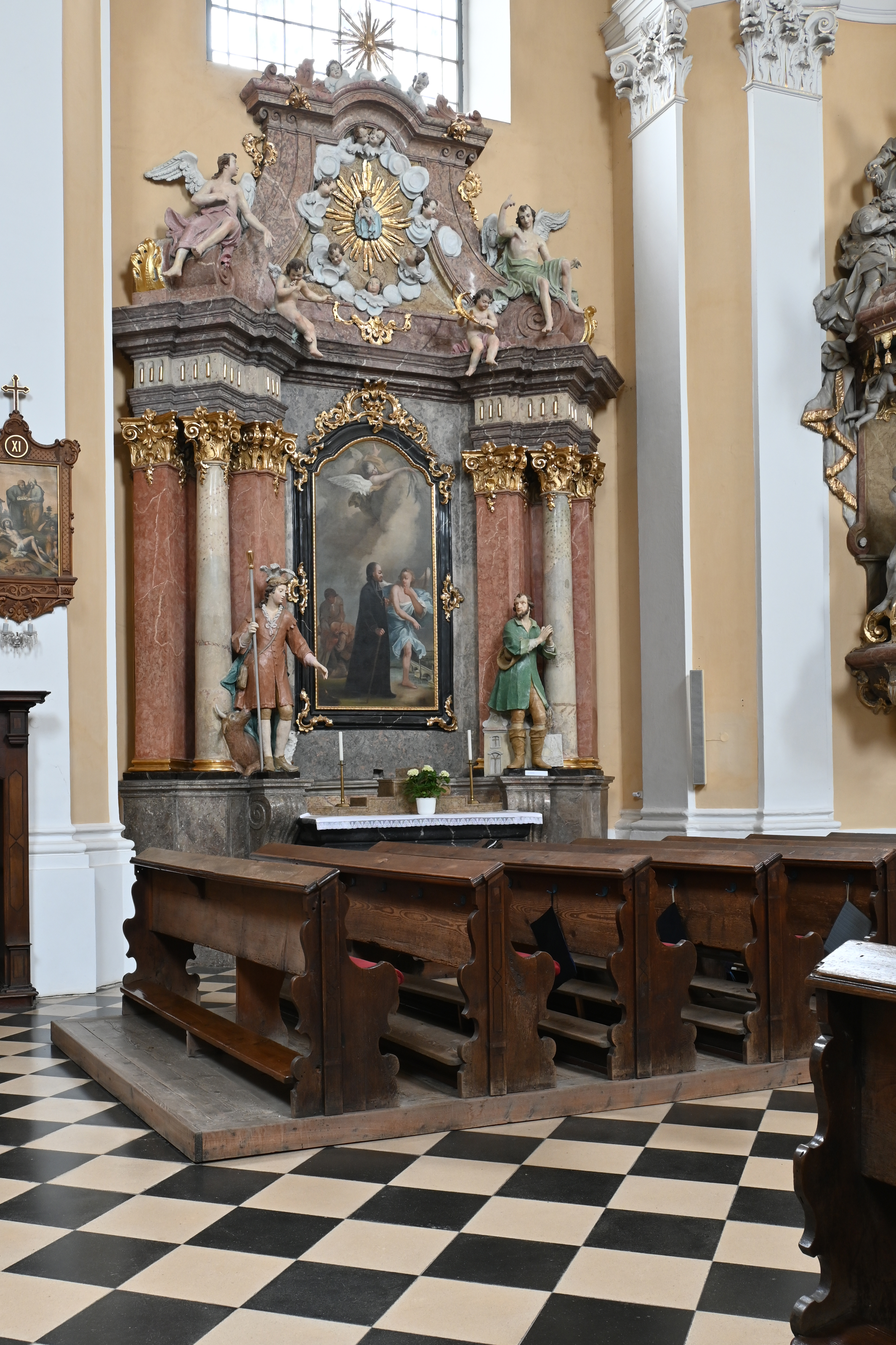 Čtyři boční štukové oltáře (sv. Jana Nepomuckého, sv. Anny, Ukřižování Páně a Bolestné Panny Marie) byly ve spodní části zavlhlé, jejich štukové části byly nesoudržné a několikrát monochromně přetírané. Rozšířené restaurátorské průzkumy prokázaly přítomnost původní polychromované vrstvy skryté pod novějšími monochromními nátěry.