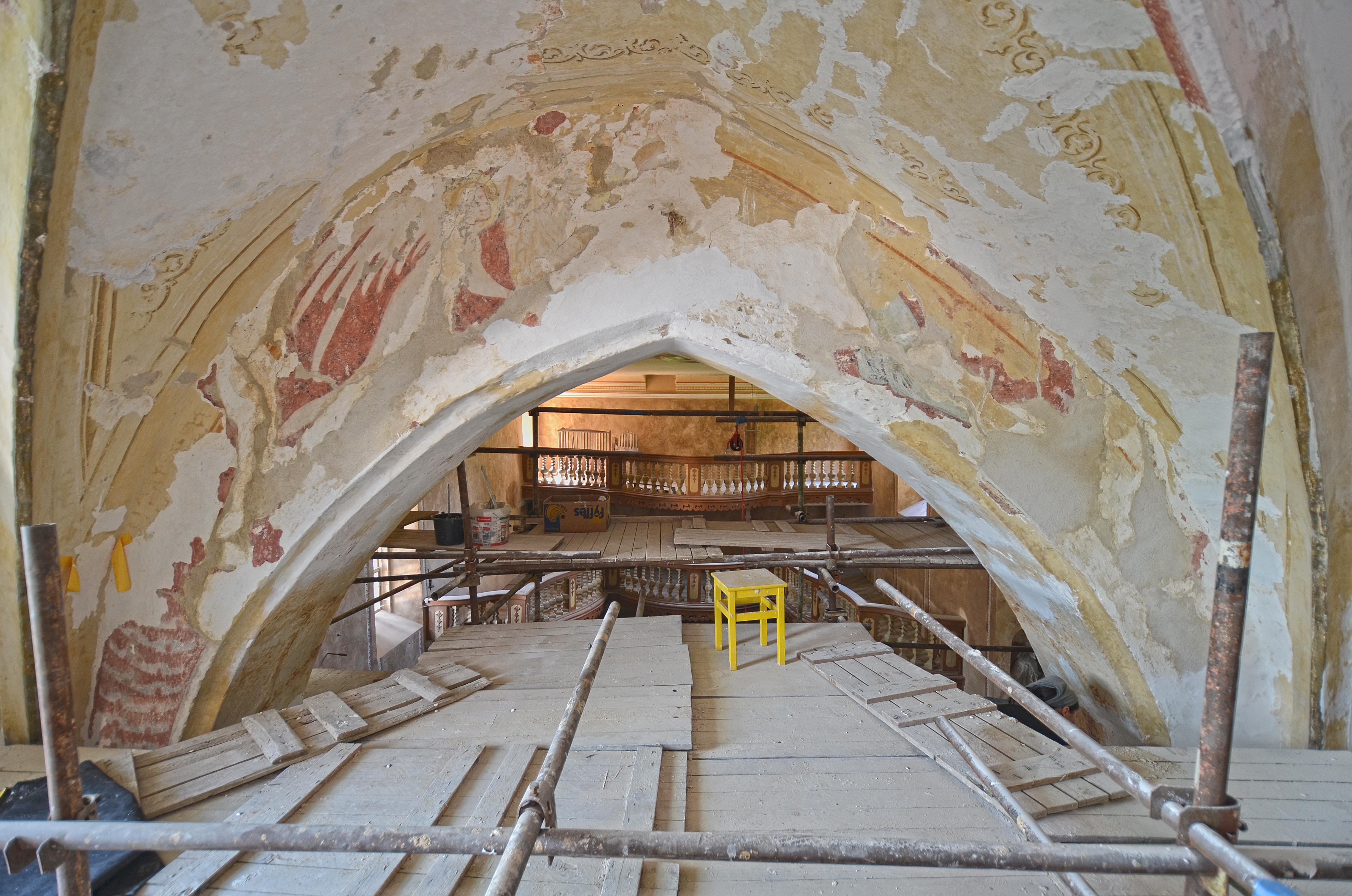 Při opravách omítek a v návaznosti na rozšíření prací do presbytáře byly objeveny hodnotné gotické malby v několika vrstvách, které je možné datovat přibližně do 15. století. K nálezům patří např. nástěnná malba s iluzivní, pozdně gotickou architekturou s fiálami a vimperkem, která akcentuje poměrně jednoduše pojatý sanktuář. Uprostřed této iluzivní architektury je kvalitně provedená malba Bolestného Krista. V pravé části presbytáře, nad pásem s iluzivní zavěšenou draperií, můžeme spatřit monumentálně pojatou scénu Nesení kříže, na niž zřejmě navazovala scéna s Ukřižováním. Dalším velmi zajímavým výjevem je scéna se dvěma ženskými postavami s obrácenými lampami, které byly zřejmě součástí cyklu Panen moudrých a pošetilých. V současnosti NPÚ ÚOP v Lokti spolupracuje na interpretaci a časovém zařazení nálezu s prof. PhDr. Ing. Janem Roytem, Ph.D., DSc. a specialisty z Generálního ředitelství NPÚ. Stav maleb je monitorován a probíhají odborná jednání o dalším postupu záchrany kostela.