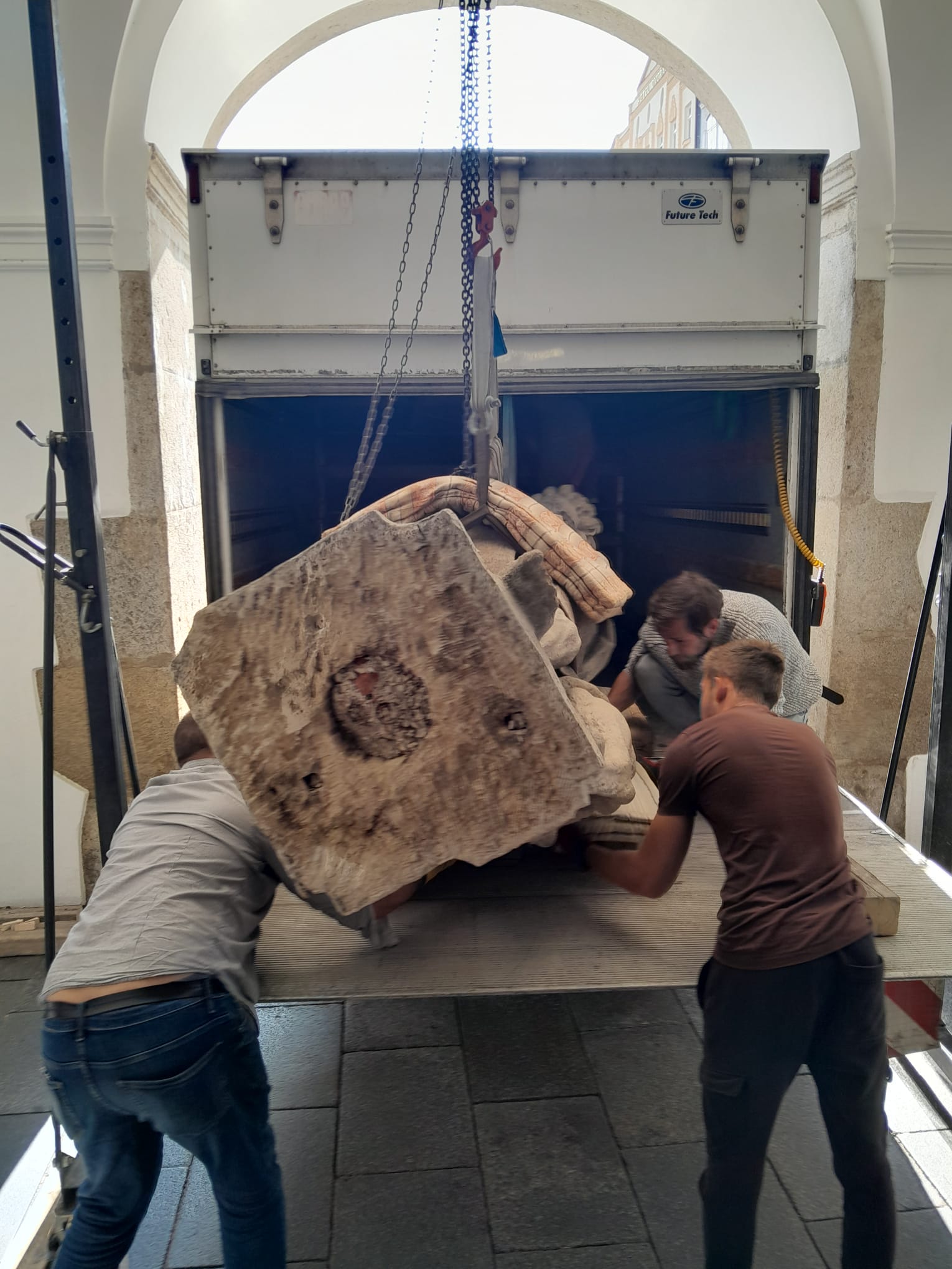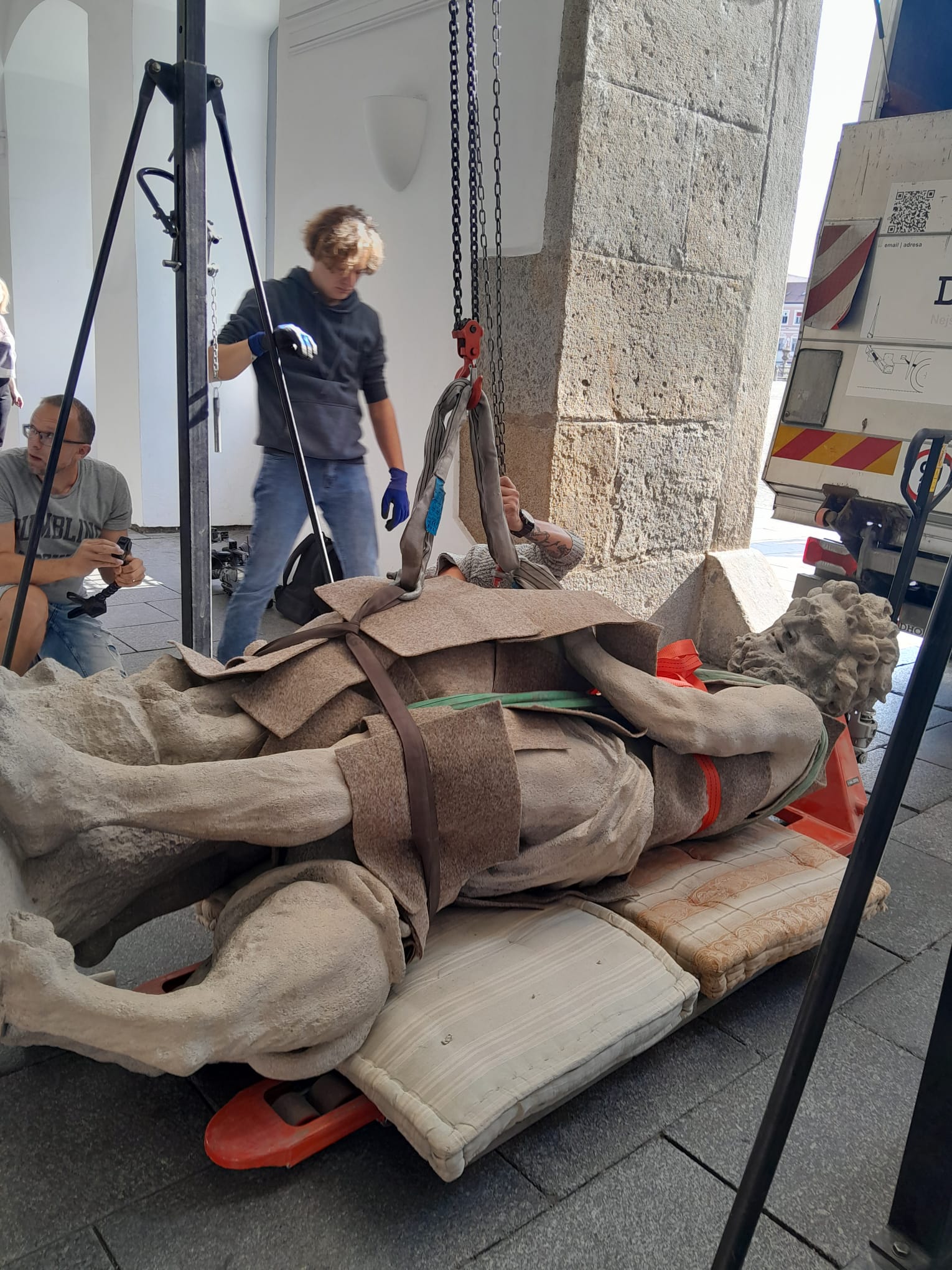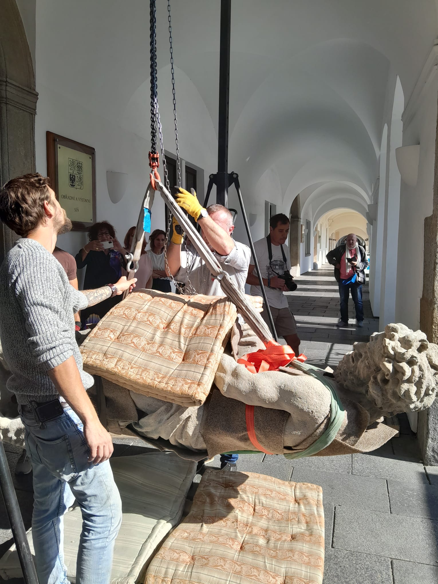 Převoz takto rozměrného a historicky cenného díla si vyžádal důkladnou přípravu a profesionální technické zajištění. Čtyřčlenný tým zkušených restaurátorů pod vedením Jana Kracíka, vedoucího ateliéru restaurování soch Akademie výtvarných umění v Praze, provedl ve středu odborné sejmutí sochy z kamenného podstavce. Pomocí portálového jeřábu a speciálně připravených silonových lan byla plastika bezpečně uložena do vodorovné polohy na transportní lůžko. Během čtvrtka pak dojde k její přepravě do Jízdárny Pražského hradu, kde proběhne její instalace na výstavní podstavec.