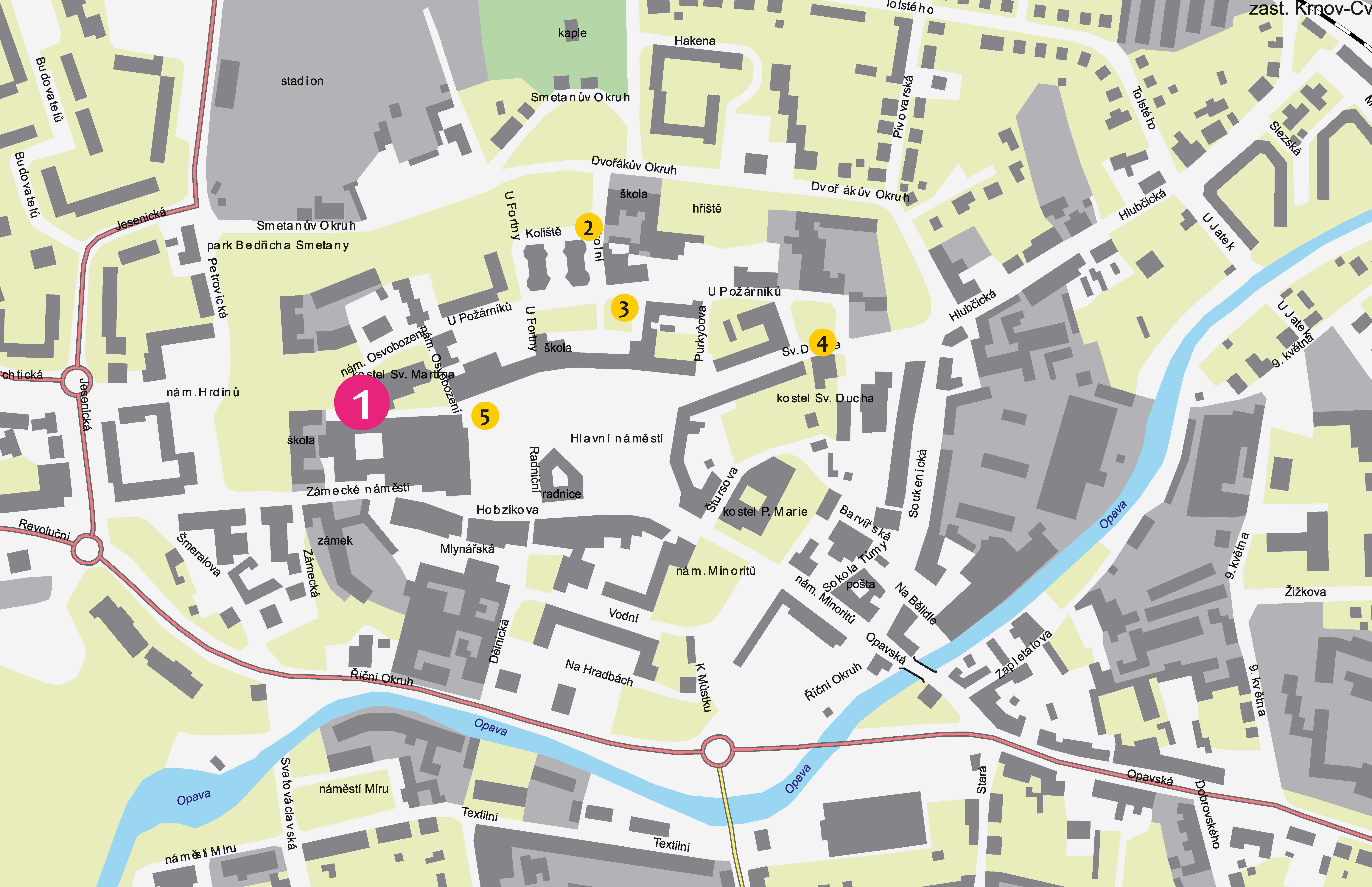 První panel se nachází před kostelem sv. Martina, představí blíže městský kostel ve světle archeologických výzkumů a stavebněhistorického průzkumu, stejně jako i někdejší přilehlý hřbitov. Další prezentuje původní hradební věž, která stála v místech dnešní Školní ulice, vypovídá o opevnění města Krnova, jež bylo již záhy po roce 1253 obehnáno impozantním prstencem kamenných hradeb. Třetí panel ukáže osudy již neexistujícího tzv. „ordonančního domu“ na ulici U Požárníků a nabídne vhled do podoby a zázemí krnovského měšťanského domu. Předposlední zastávka je v ulici Sv. Ducha, kde se tyčila Hlubčická brána, jejímž prostřednictvím vstupovala do města od severovýchodu dálková cesta z Horního Slezska, archeologický výzkum, uskutečněný v místech, kde se nacházela, umožnil poodhalit vývoj fortifikačního systému města. Poslední zastavení se nachází na Hlavním náměstí, přibližuje reprezentativní i administrativní veřejný prostor a infrastrukturu ulic středověkého a raně novověkého Krnova.