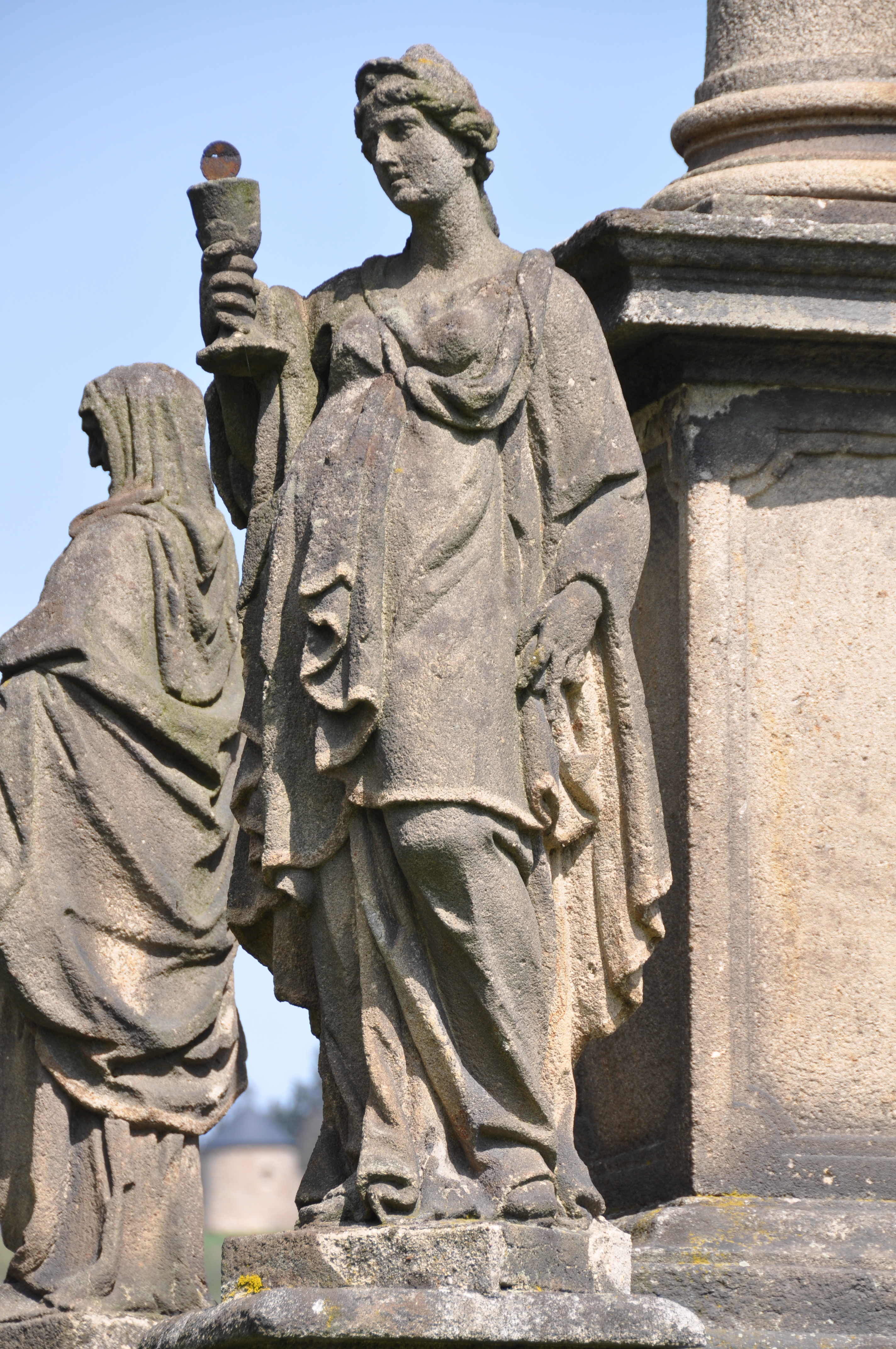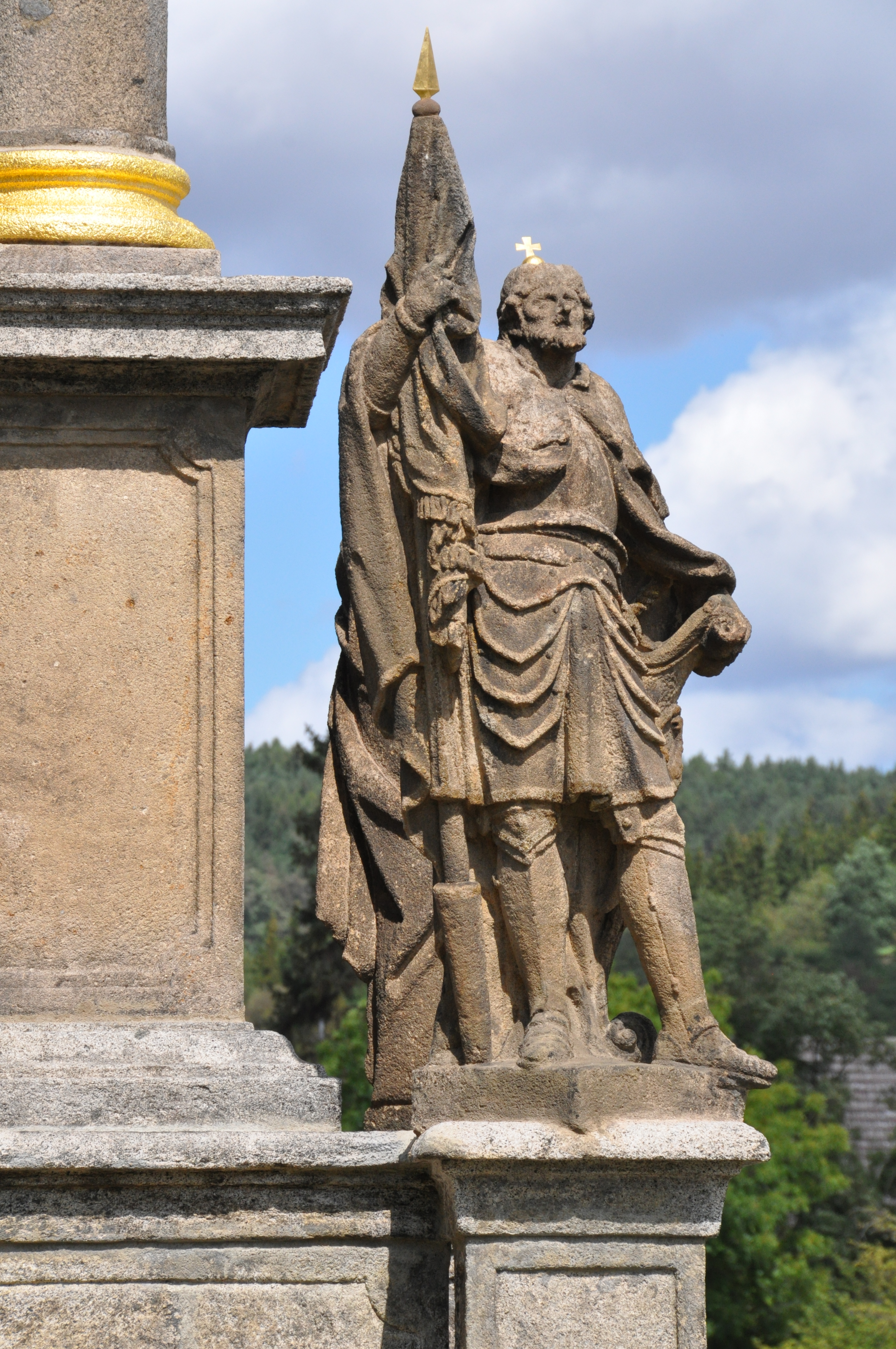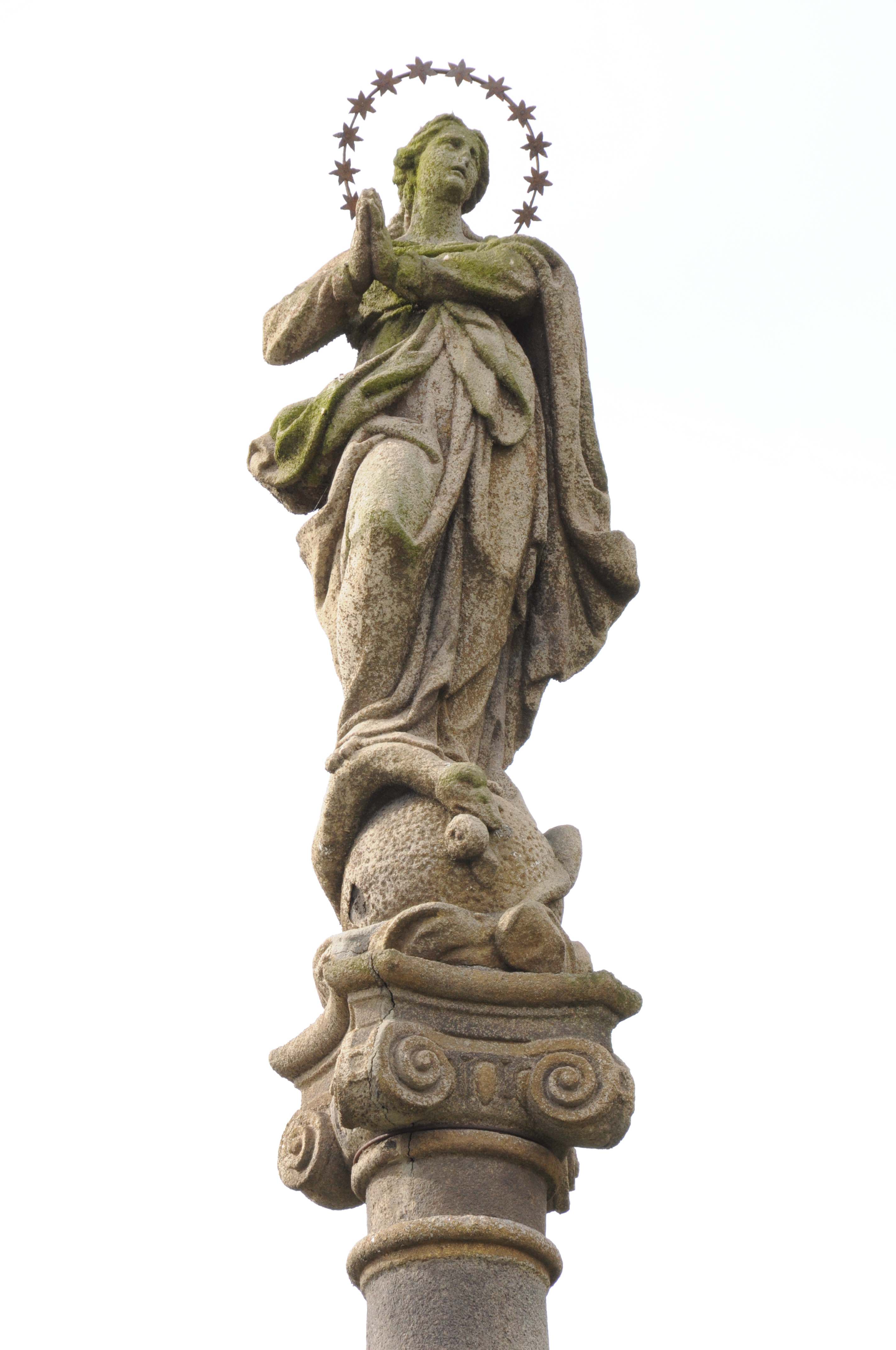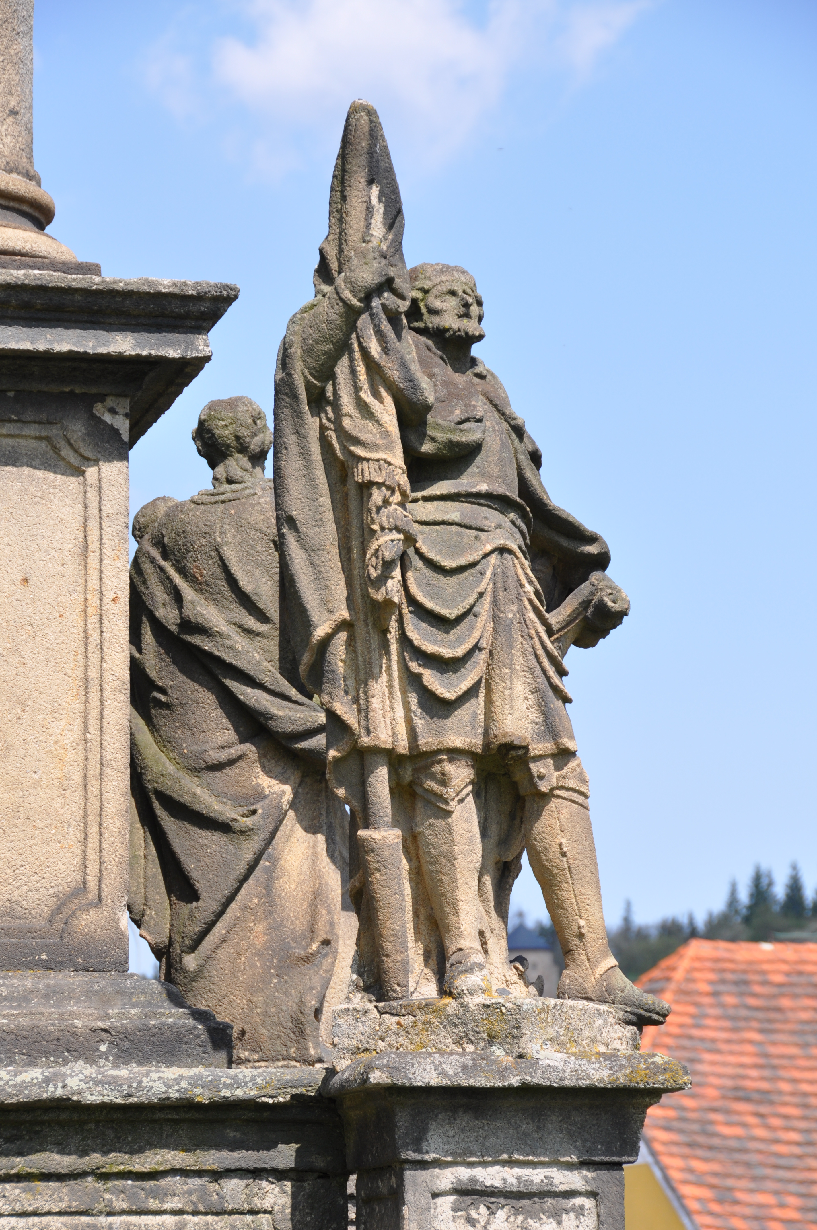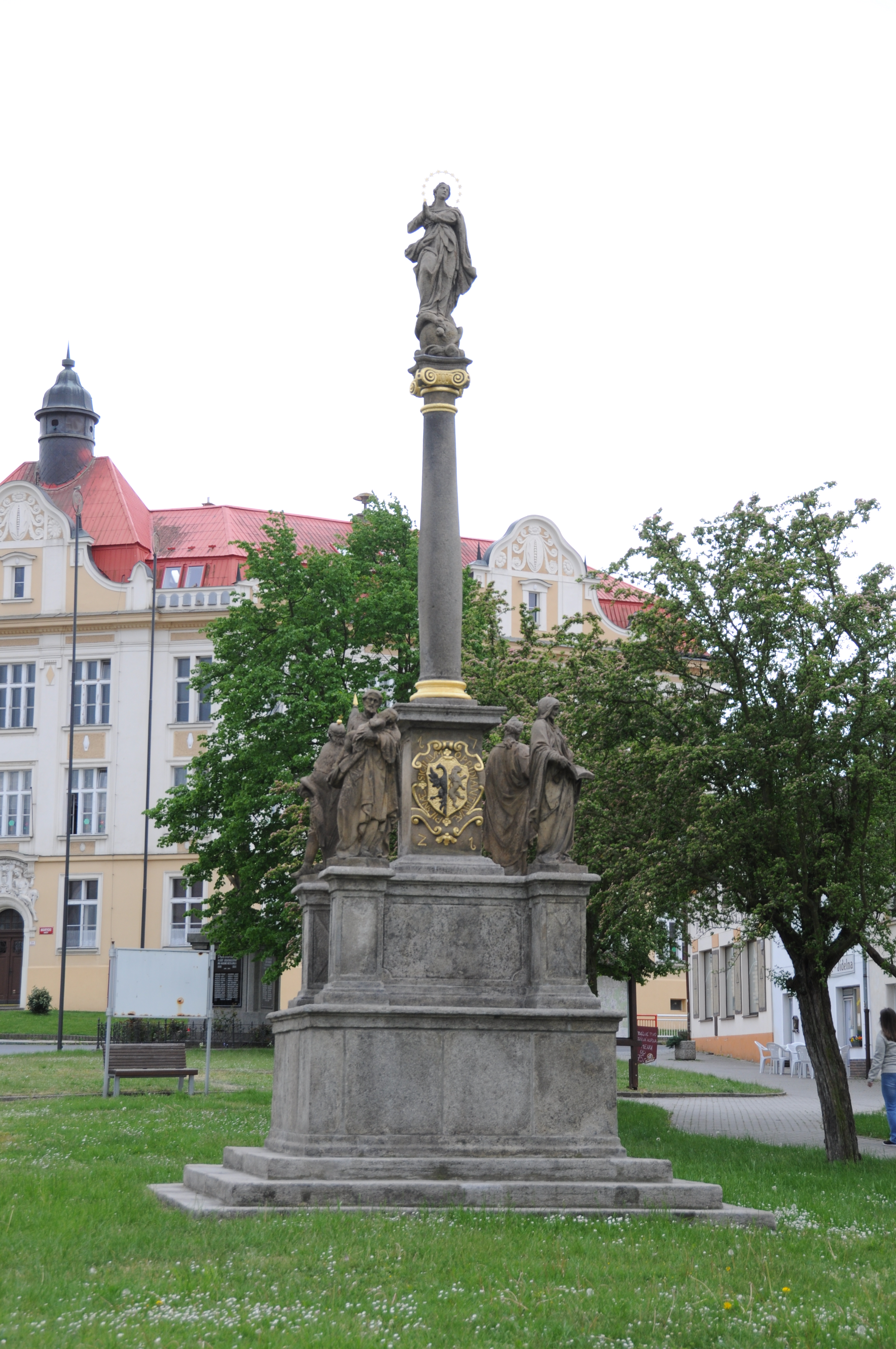 Materiálem sochařské výzdoby sloupu je střednězrnný pískovec okrové barvy, architektonické části jsou zhotoveny ze žuly. V horní části mohutného trojdílného podstavce čtvercového půdorysu se nalézá čtveřice soch – sv. Josef, sv. Václav, sv. Barbora a sv. Anna. Mezi sochami je na hranolovém podstavci, s čelní stěnou zdobenou znakem města Starého Plzence s letopočtem 1721, osazen sloup s patkou a volutovou hlavicí nesoucí sochu Panny Marie (Immaculaty); světice stojí na zeměkouli obtočené hadem. Zatímco na čelní straně sloupu najdeme světce vztahující se k neposkvrněnému početí Panny Marie, na zadní straně sloupu stojí sochy světců – ochránců, a to konkrétně hlavní český zemský patron sv. Václav a oblíbená patronka dobré smrti sv. Barbora.