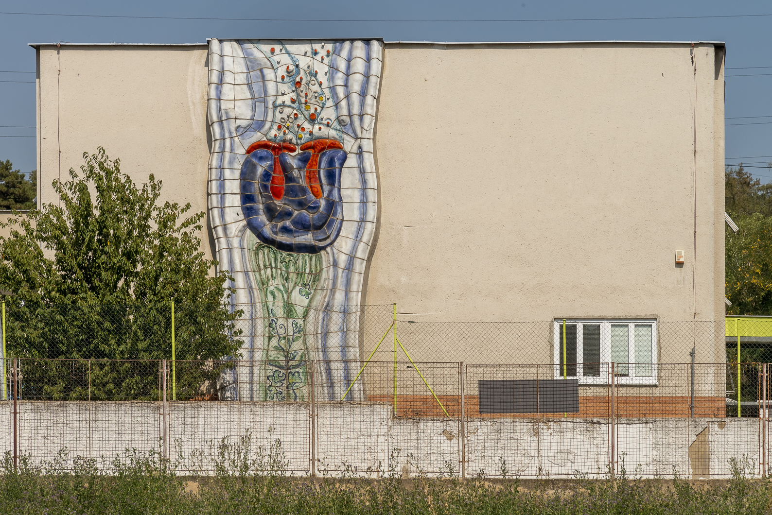 Svůj rozsáhlý reliéf prostupující celou výškou budovy, komponovala téměř zapomenutá autorka jako stylizovaný modrý květ umístěný na vztyčených rukou. Dobře dochované dílo s rozměry 340 x 1000 cm patří zcela jednoznačně k nejkvalitnějším a nejpozoruhodnějším příkladům umění osmdesátých let v Brně. Ačkoli reliéf není památkově chráněn, jeho zánik v důsledku přestavby budovy by pro město představoval značnou a nenahraditelnou ztrátu. Národní památkový ústav, územní odborné pracoviště v Brně proto hledá spolu se současnými majiteli jeho nové umístění, které by zároveň dílu ponechalo původní funkci, tedy doplněk veřejného prostoru či veřejné stavby. V případě vašeho zájmu se proto neváhejte obrátit na pracovníky Národního památkového ústavu. S radostí přispějí k případné nové instalaci či budoucnosti díla, které umění Brna neodmyslitelně patří.