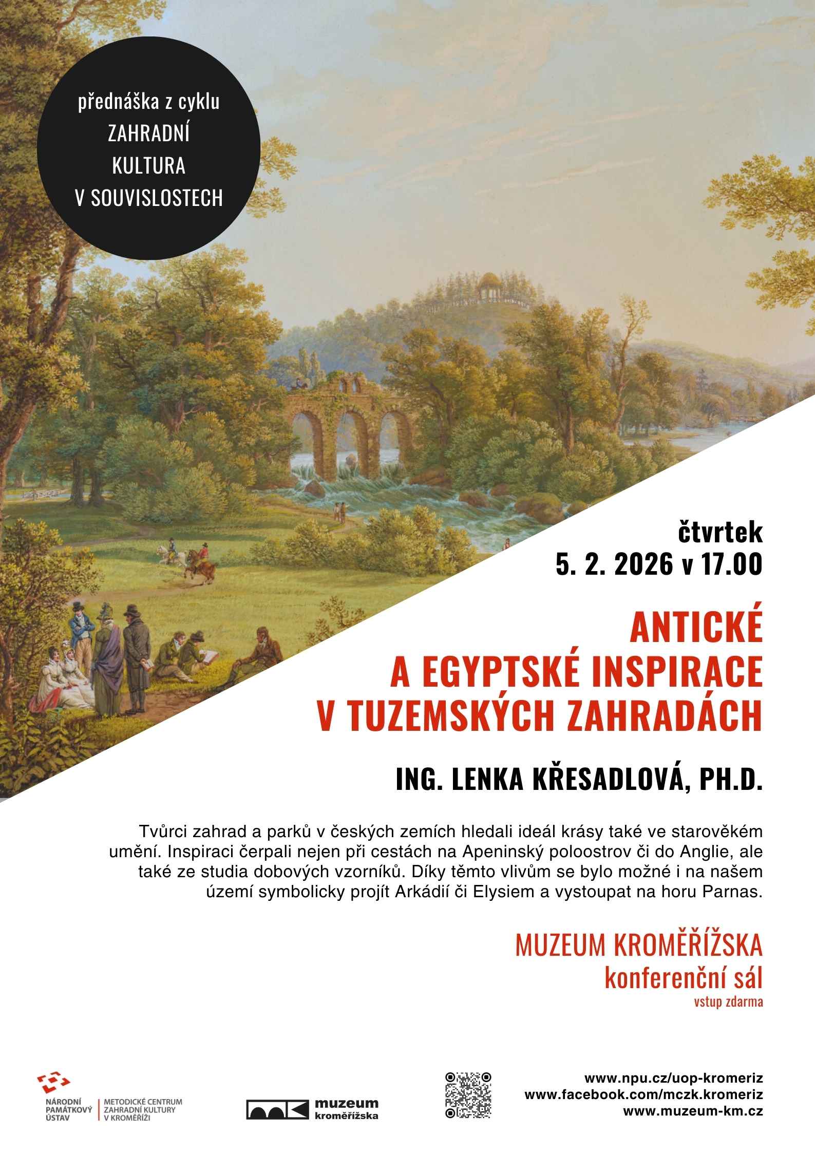 Přednáší Ing. Lenka Křesadlová, Ph.D., zahradní architektka a vedoucí Metodického centra zahradní kultury odborného pracoviště Národního památkového ústavu v Kroměříži.