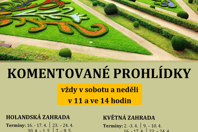 Vydejte se na procházku minulostí. Během prohlídky vám představíme nejen historii Květné zahrady, ale také její zajímavá zákoutí, stavby i mnohdy netušené souvislosti. Od 16. dubna budou pravidelné komentované prohlídky zaměřené na rozkvétající Holandskou zahradu, která je veřejnosti přístupná od podzimu 2014, kdy proběhla její vzorová obnova. Právě na jaře tak může už druhým rokem představit svou barvitou jarní květenu. Komentované prohlídky probíhají vždy v sobotu a v neděli a začínají v 11 hodin a ve 14 hodin.